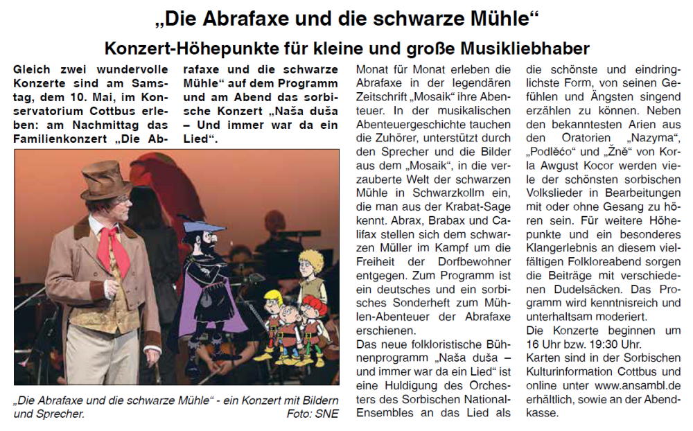 Konservatorium Cottbus stattfanden. Eins davon war das Familienkonzert Die Abrafaxe und die schwarze Mühle.