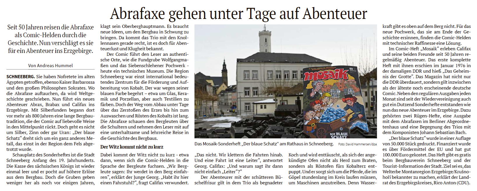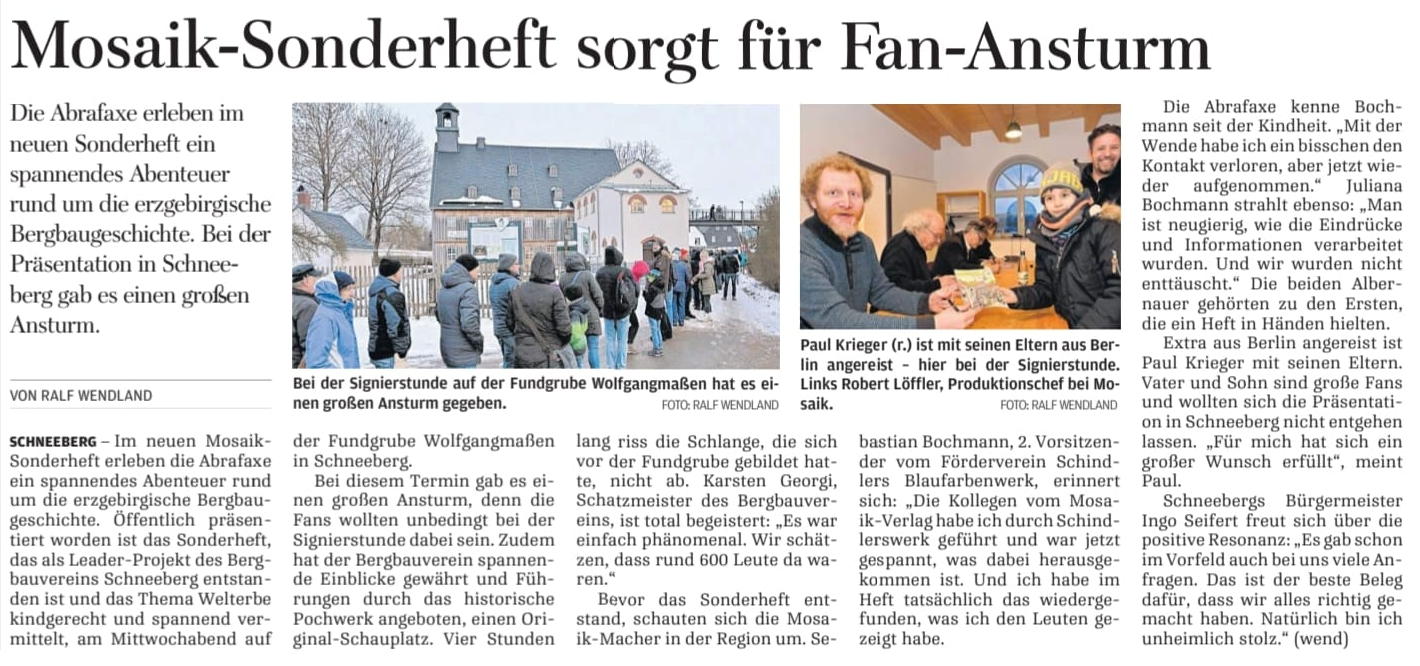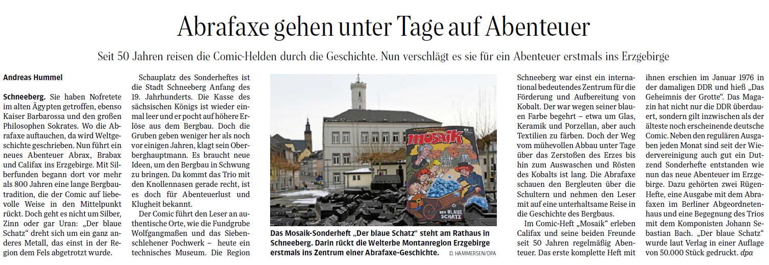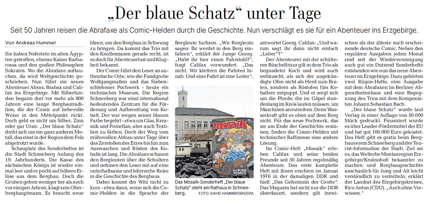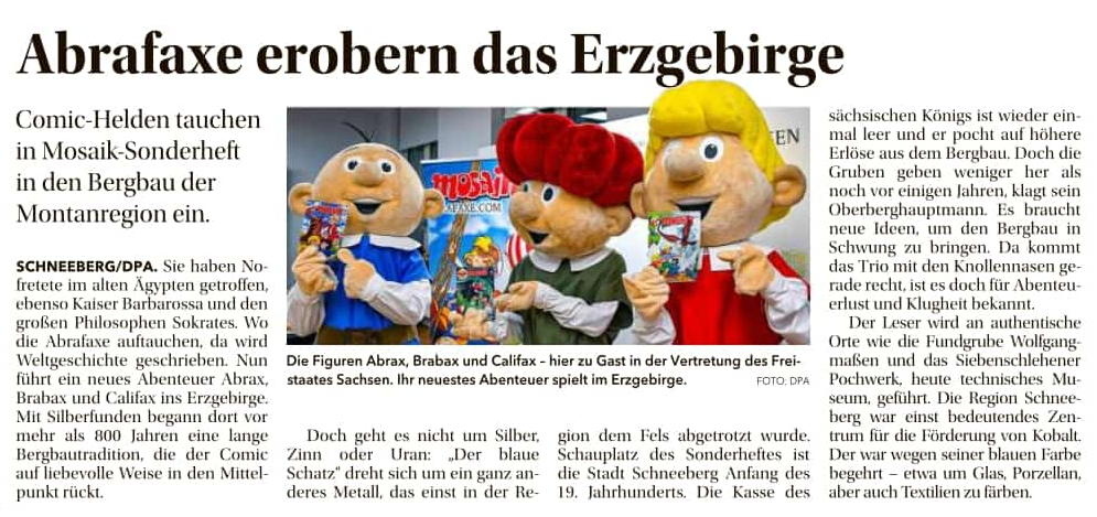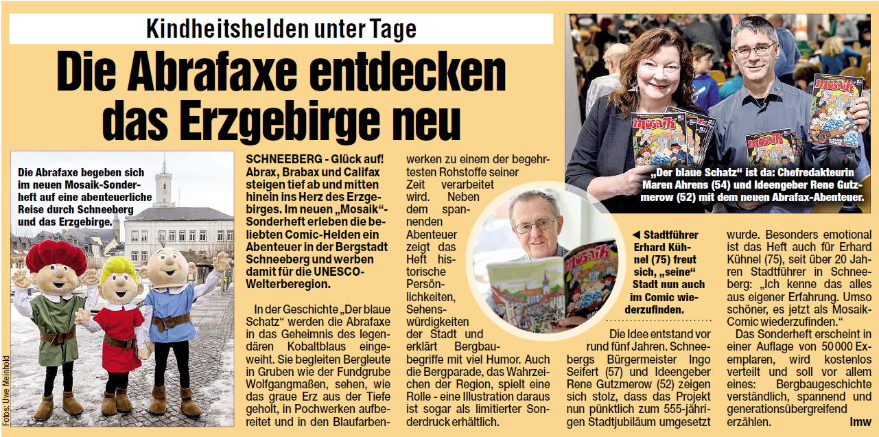 Auer Ausgabe der Freien Presse der Beitrag über das Schneeberger Bergbau-Sonderheft der Abrafaxe.
