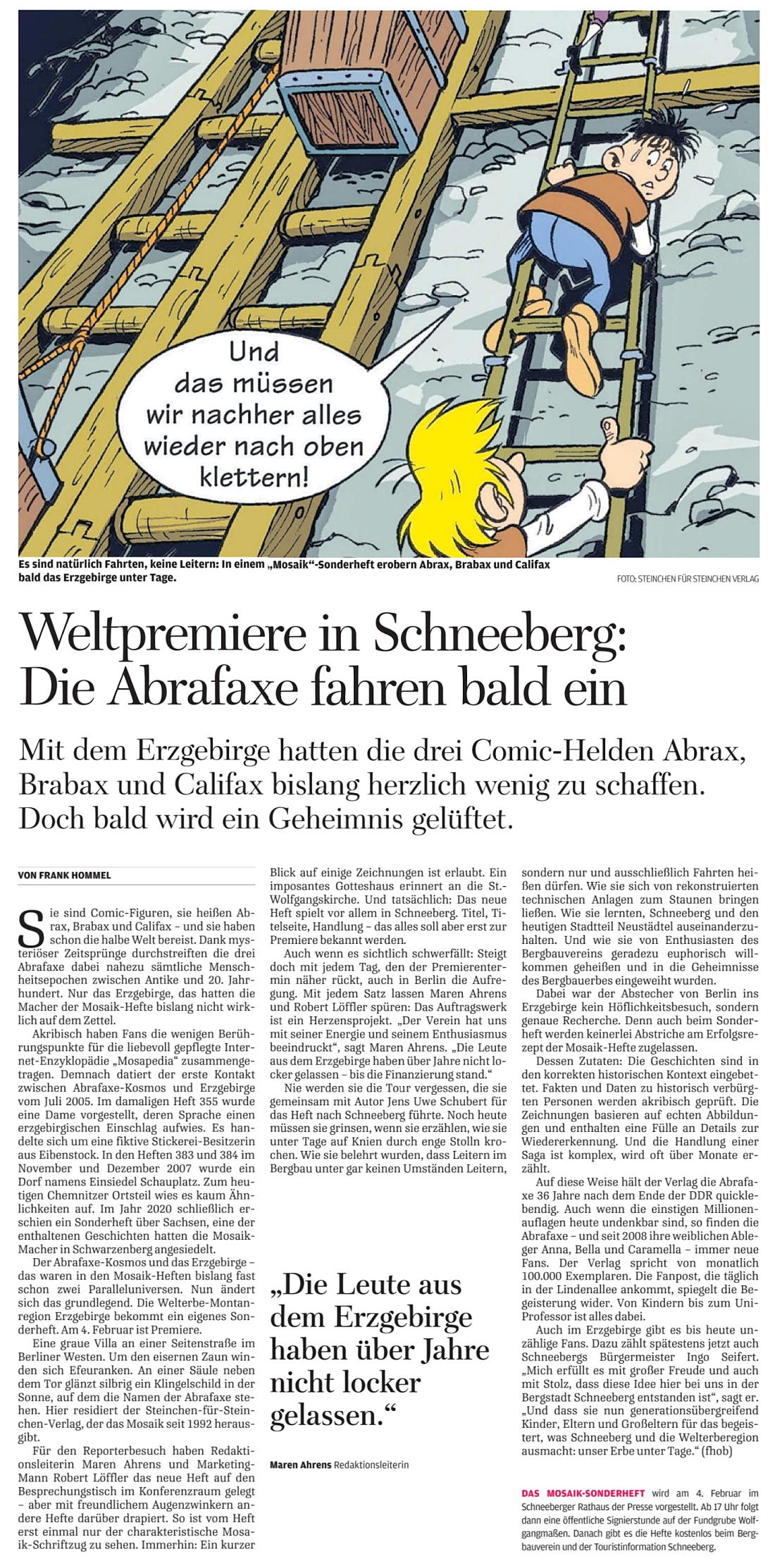 Freie Presse, 29.01.2026, Ausgabe Aue, „Abrafaxe machen jetzt das Erzgebirge unsicher“ von Jürgen Freitag, Seite 9