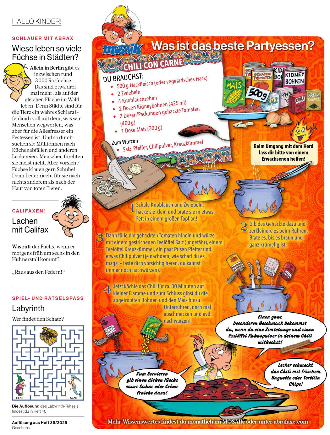 Daneben werden die Rubriken Schlauer mit Abrax: Wieso leben so viele Füchse in Städten?