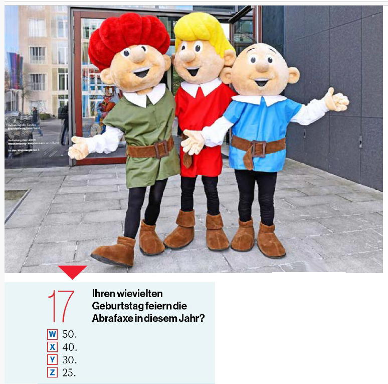 die er nicht nur richtig beantwortete, sondern auch ergänzte, dass die Digedags inzwischen von den Abrafaxen abgelöst wurden.