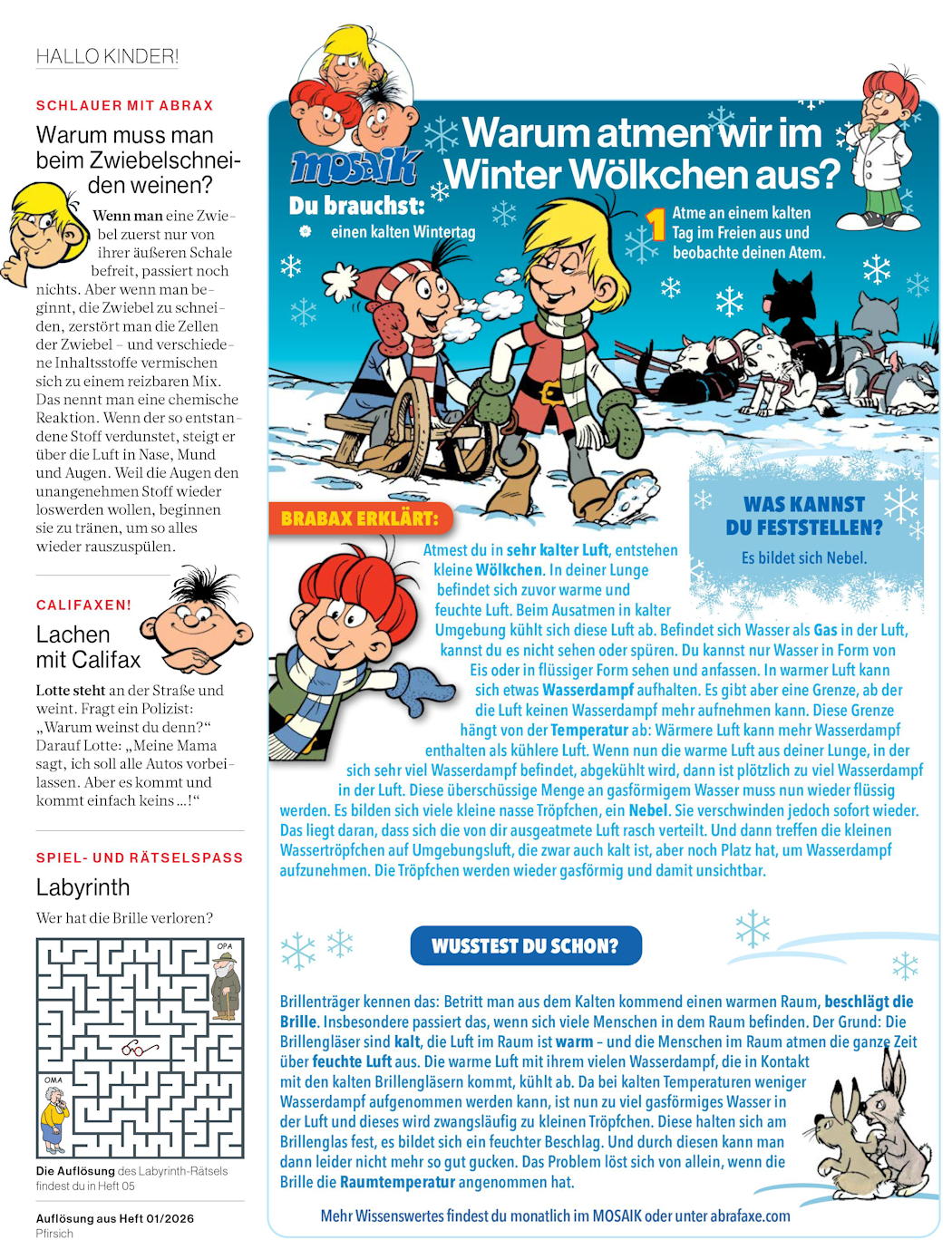 Daneben werden die Rubriken Schlauer mit Abrax: Warum muss man beim Zwiebelschneiden weinen?