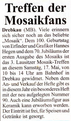 am 17. Mai 2025 das 3. Lausitzer Mosaik-Treffen in Drebkau an. Hier wird auch ein besonderes Heft mit der neu