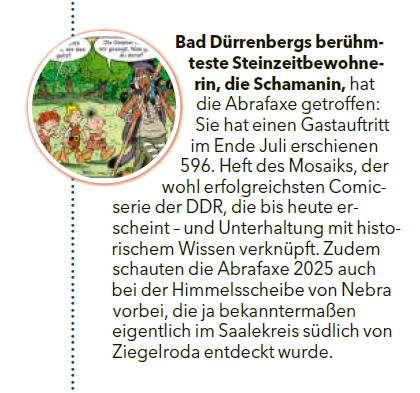 wird berichtet: Bad Dürrenbergs berühmteste Steinzeitbewohnerin, die Schamanin, hat die Abrafaxe getroffen: Sie hat einen Gastauftritt
