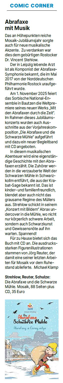 Ostsee-Zeitung, 3.1.2026, „Comic-Corner: Abrafaxe mit Musik“ von Michael Klamp, Seite 25