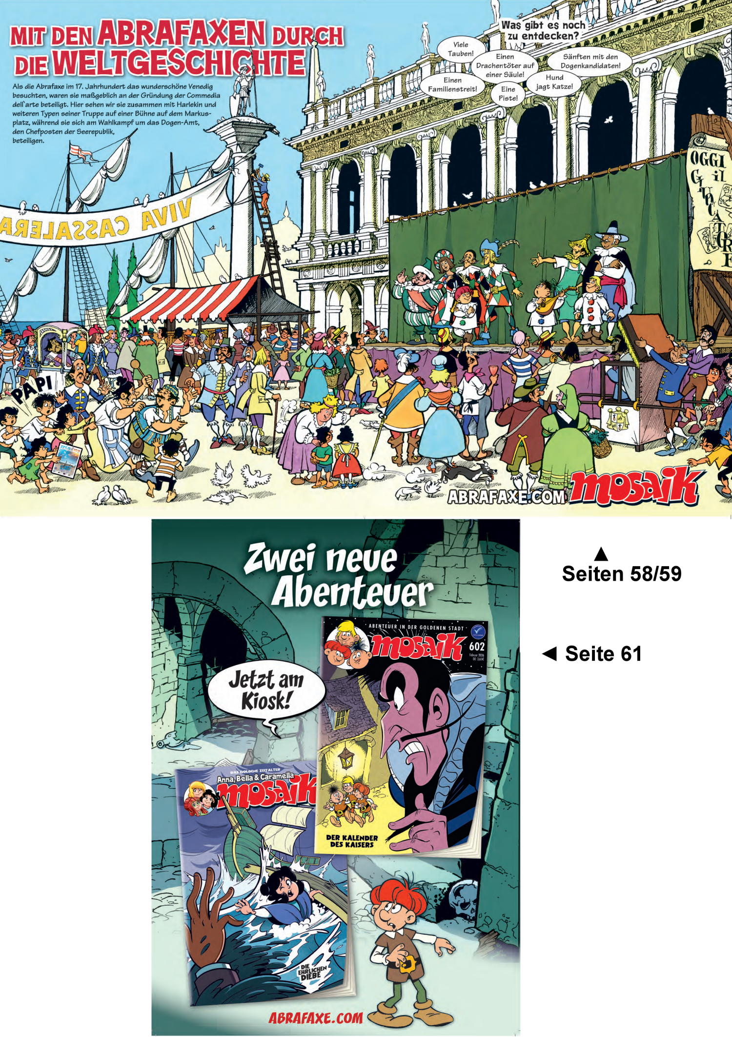 Monatlich werden Such- und Wimmelbilder mit den Abrafaxen und MOSAIK-Werbung veröffentlicht.
