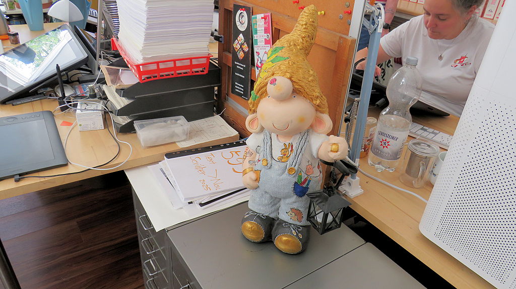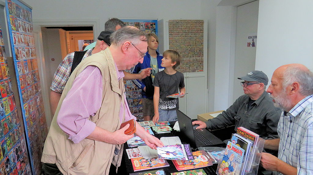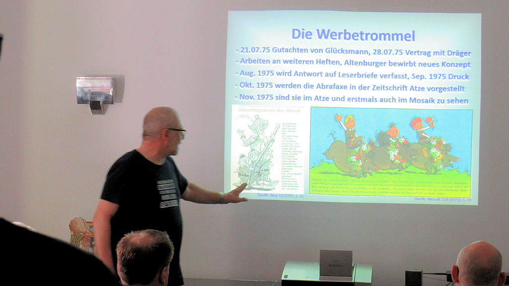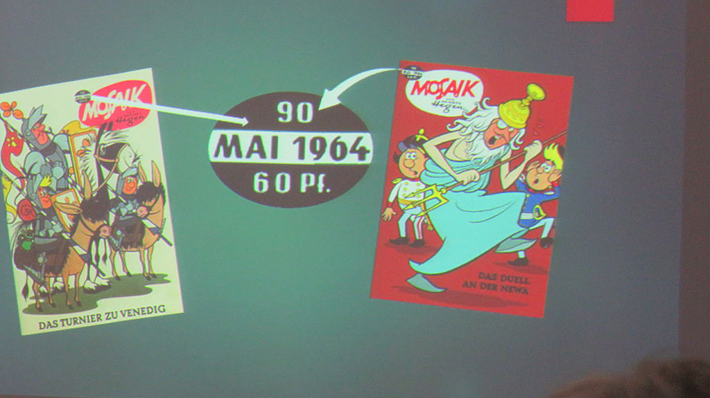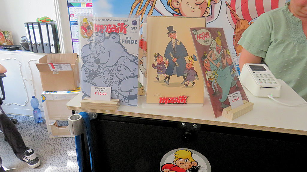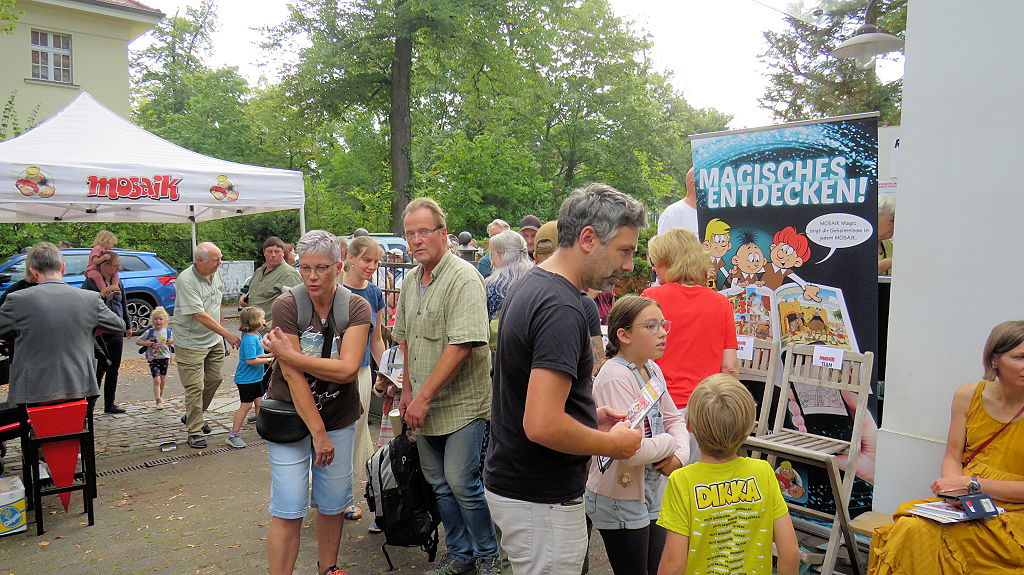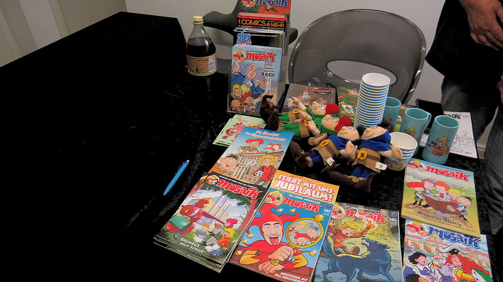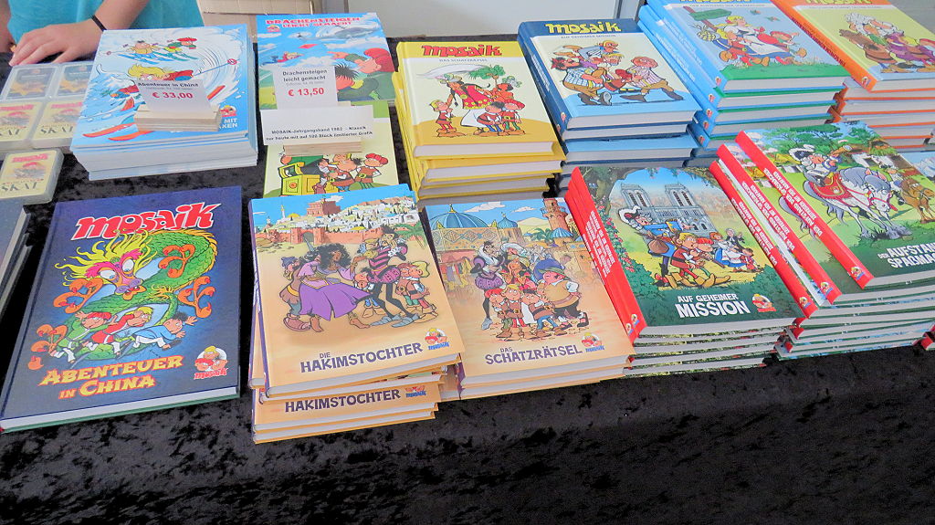 Nun ist der Termin im Endsommer für den Tag der offenen Tür beim Mosaik Steinchen für Steinchen Verlag bereits etabliert, und das späte Hochsommerwetter kam zur Veranstaltung im Jubiläumsjahr wie bestellt. Wieder gab es einen Riesen-Ansturm der Fans, ein volles Haus und lange Schlangen. Interessante Vorträge zur Geschichte und zur Zukunft des Mosaik, der Mosaik-Shop mit vielen Raritäten, die traditionelle Verlagsführung im 15-Minuten-Takt, die Fanclubangebote und besonders auch die Autogramme der Zeichner waren gefragt. Die exklusive Ausbeute an Verlagsprodukten, Sammlerstücken und Autogrammen erfreute das Sammlerherz.