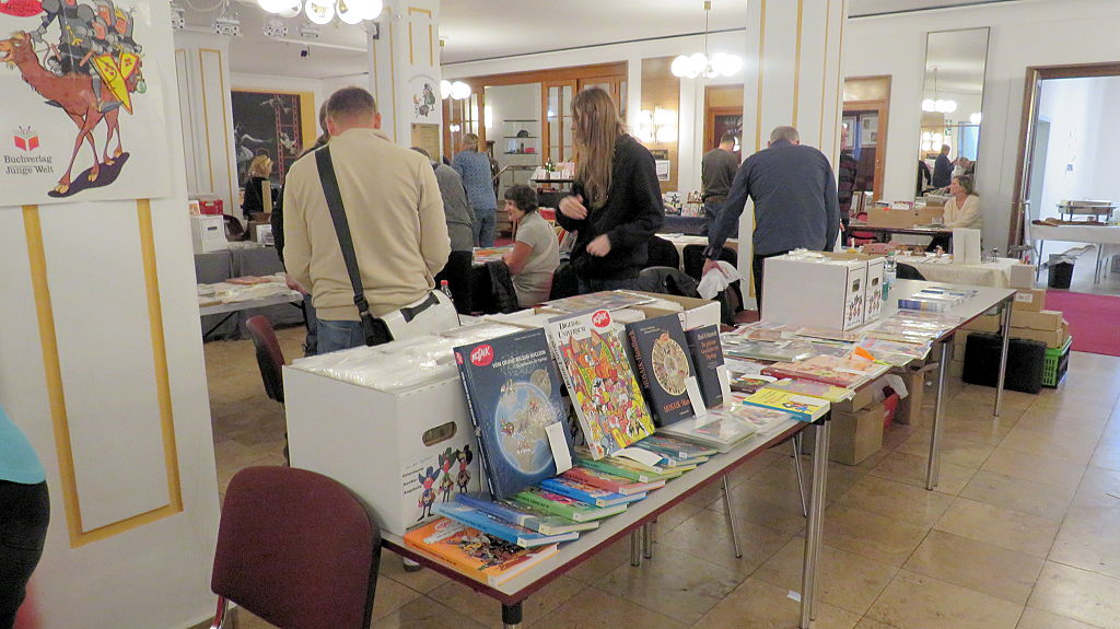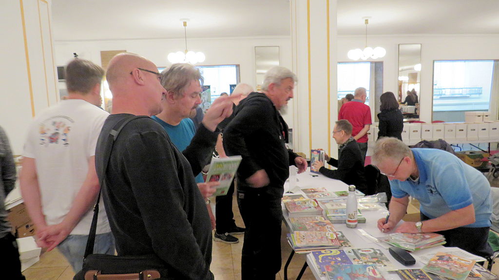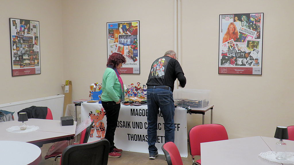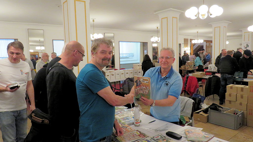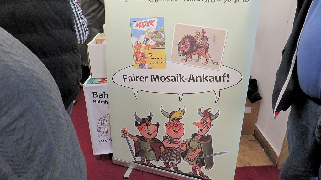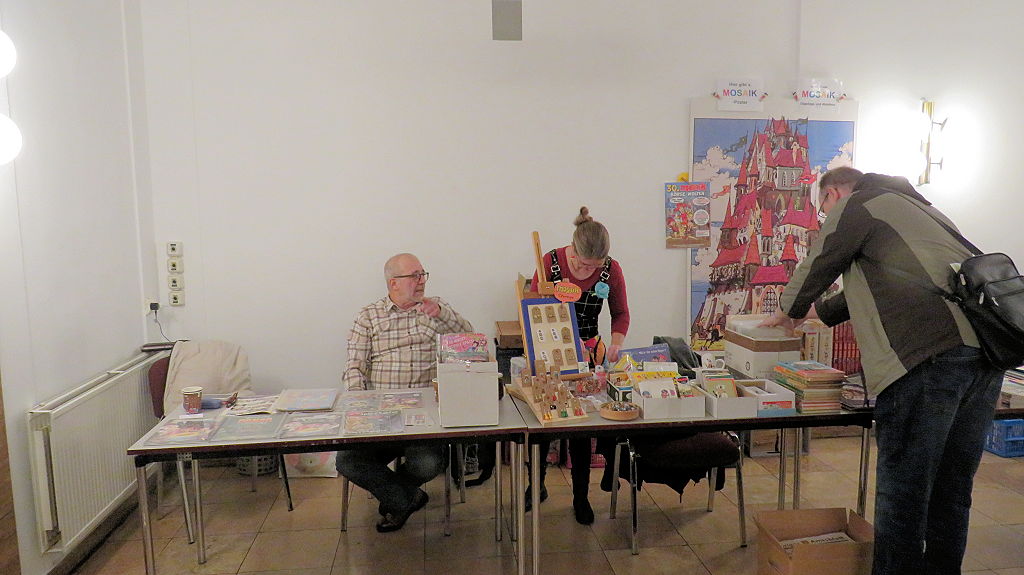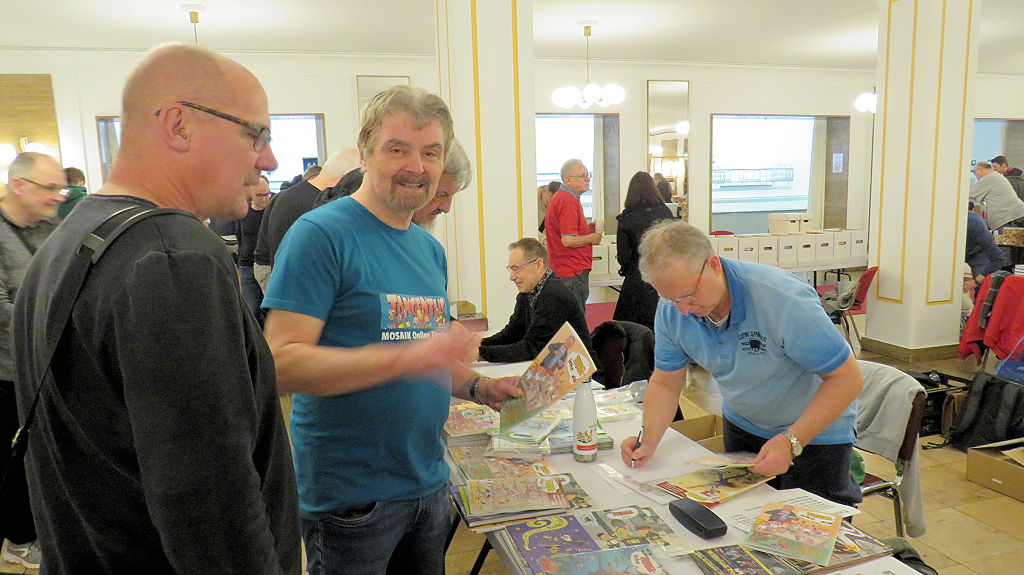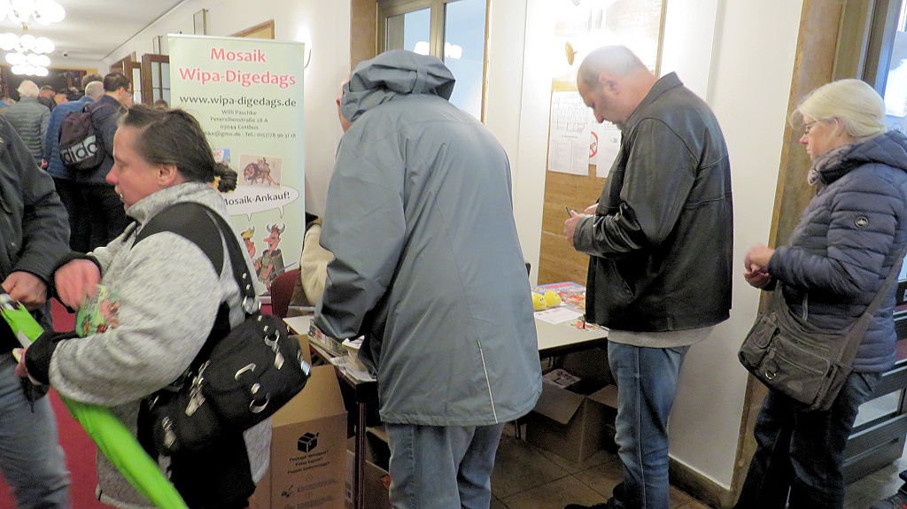 Die 30. Mosaik-Börse machte der Jubiläumszahl alle Ehre, denn auch die anderen Jubiläen des Mosaik-Universums wurden ausgiebig gefeiert. Deshalb war es zu erwarten, dass erneut eine Rekordzahl an Besuchern in das Kulturhaus Wolfen drängte. Wie immer gab es neben den Angeboten an Mosaik-Heften und -Büchern zahlreiche neue Magazine der Fanclubs, dazu neue Ausgaben bzw. Updates der Digedags- und Abrafaxe-Kataloge sowie ein reichhaltiges Sortiment des Mosaik Steinchen für Steinchen Verlags. An letzterem Stand war der künstlerische Leiter Jörg Reuter immer dicht umlagert.