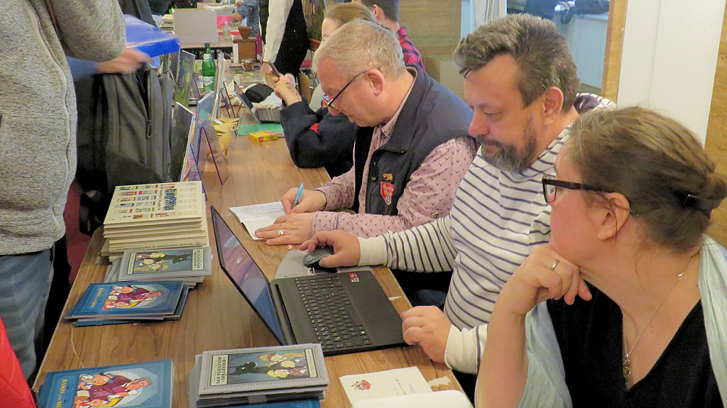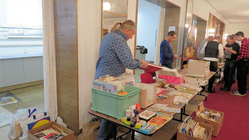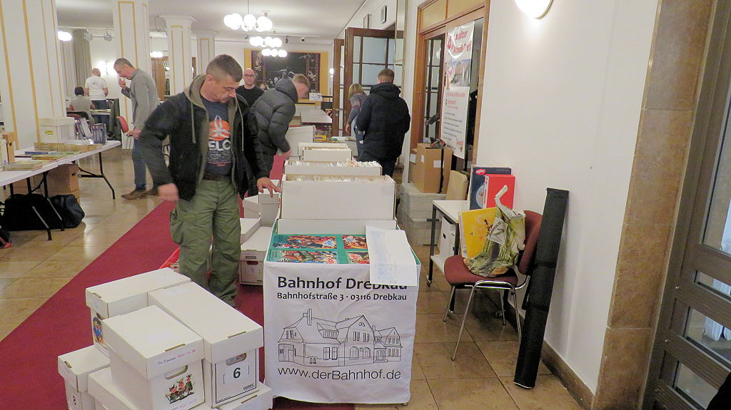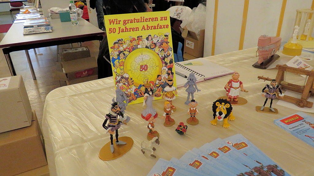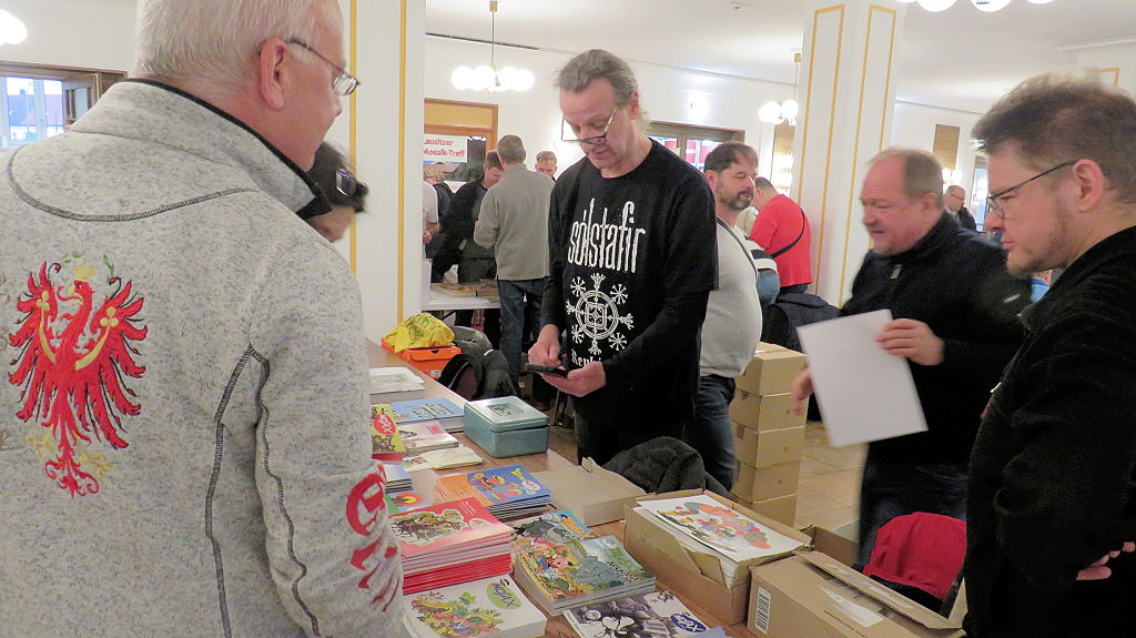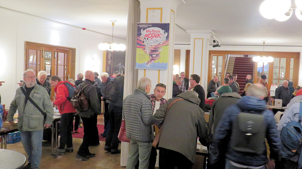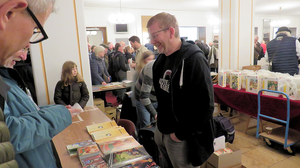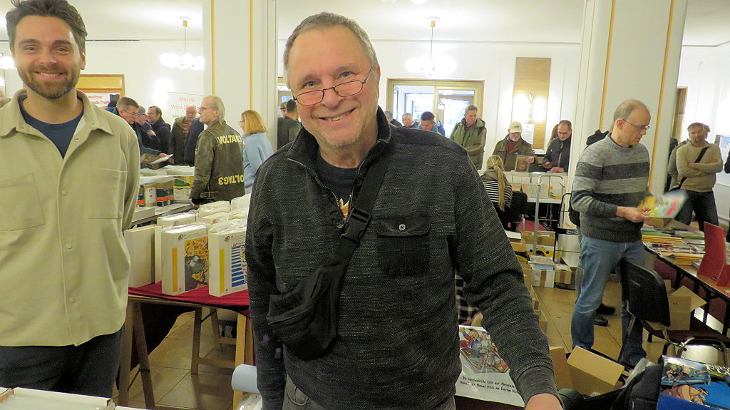 Die 30. Mosaik-Börse machte der Jubiläumszahl alle Ehre, denn auch die anderen Jubiläen des Mosaik-Universums wurden ausgiebig gefeiert. Deshalb war es zu erwarten, dass erneut eine Rekordzahl an Besuchern in das Kulturhaus Wolfen drängte. Wie immer gab es neben den Angeboten an Mosaik-Heften und -Büchern zahlreiche neue Magazine der Fanclubs, dazu neue Ausgaben bzw. Updates der Digedags- und Abrafaxe-Kataloge sowie ein reichhaltiges Sortiment des Mosaik Steinchen für Steinchen Verlags. An letzterem Stand war der künstlerische Leiter Jörg Reuter immer dicht umlagert.