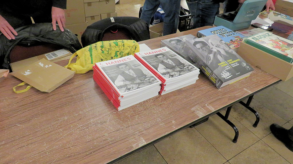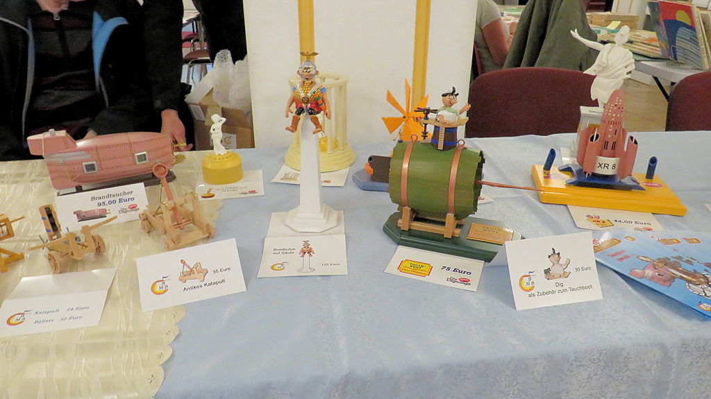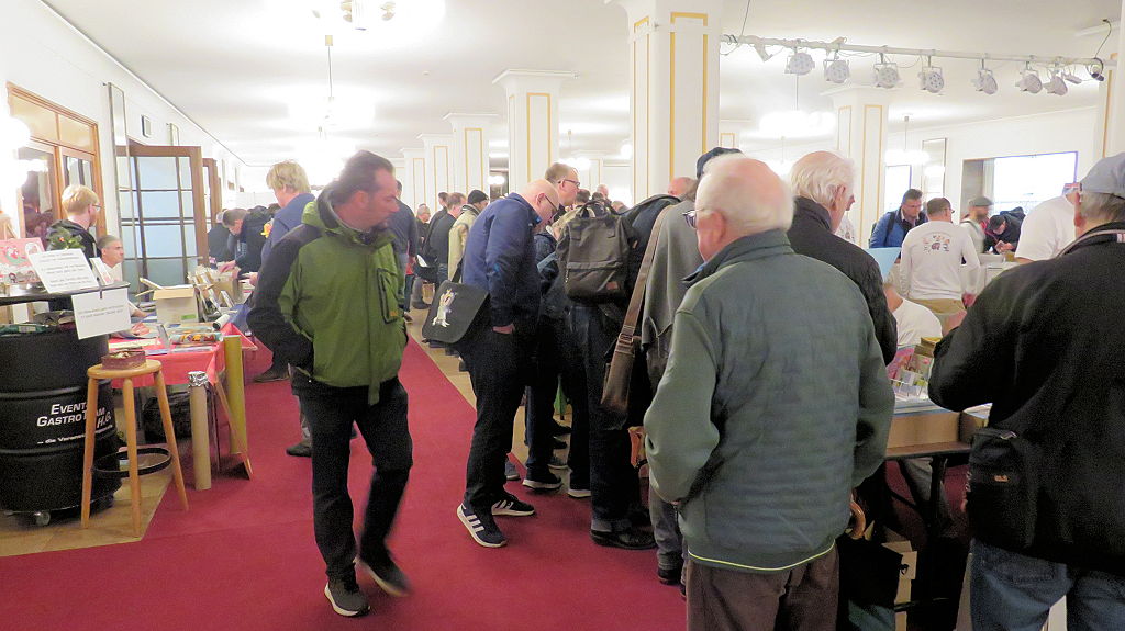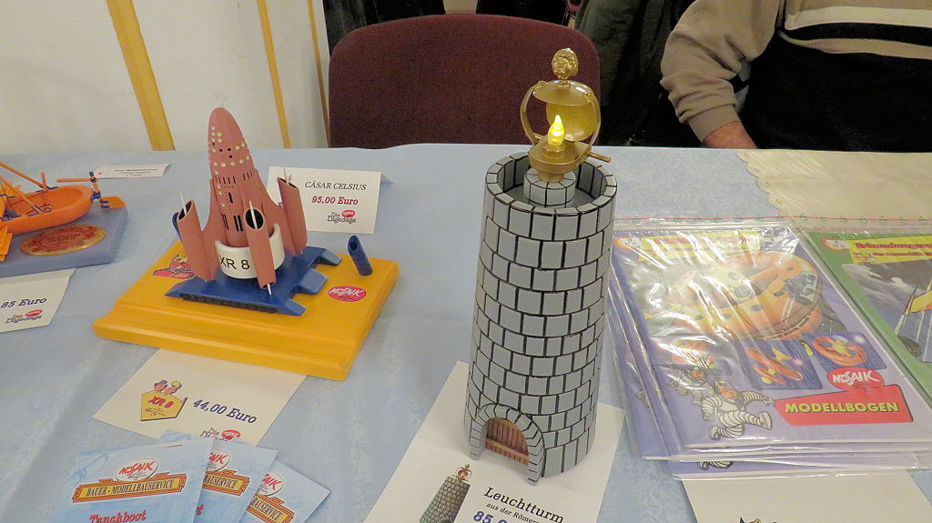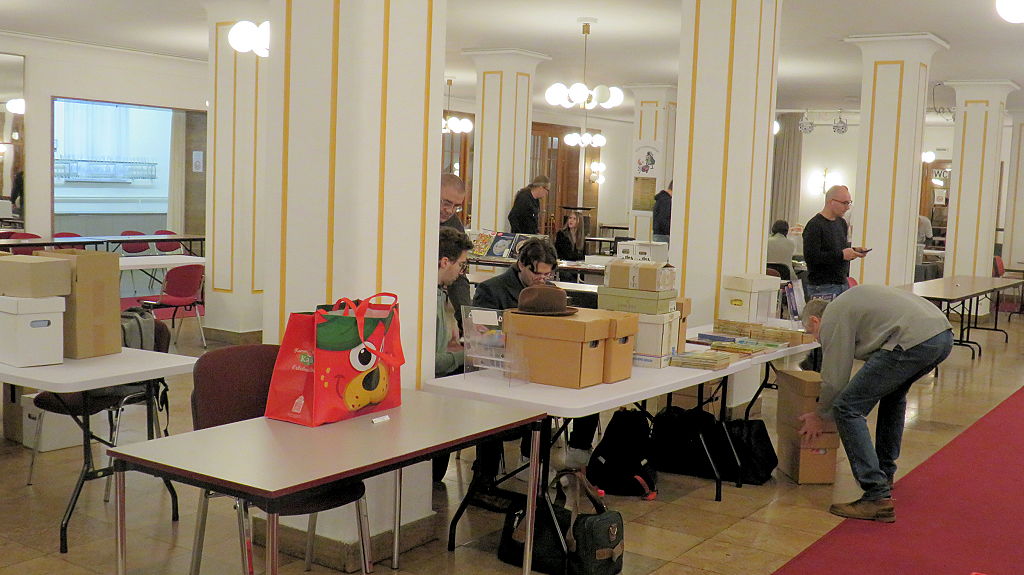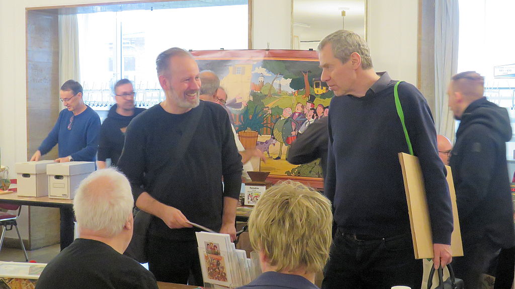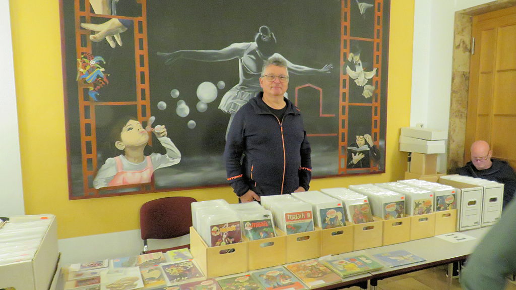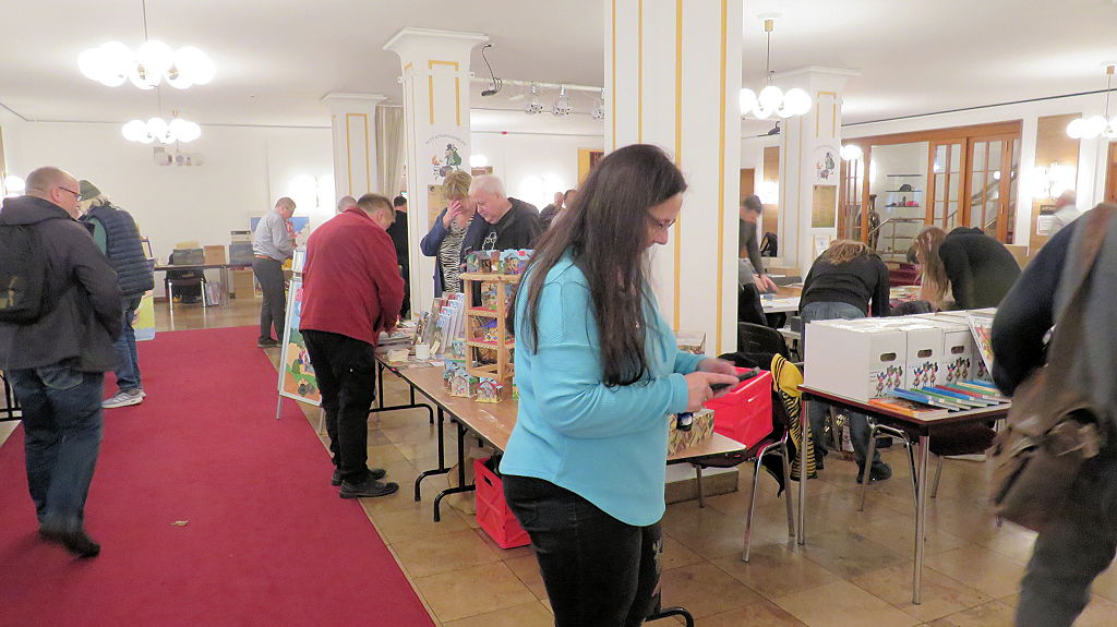 Die 30. Mosaik-Börse machte der Jubiläumszahl alle Ehre, denn auch die anderen Jubiläen des Mosaik-Universums wurden ausgiebig gefeiert. Deshalb war es zu erwarten, dass erneut eine Rekordzahl an Besuchern in das Kulturhaus Wolfen drängte. Wie immer gab es neben den Angeboten an Mosaik-Heften und -Büchern zahlreiche neue Magazine der Fanclubs, dazu neue Ausgaben bzw. Updates der Digedags- und Abrafaxe-Kataloge sowie ein reichhaltiges Sortiment des Mosaik Steinchen für Steinchen Verlags. An letzterem Stand war der künstlerische Leiter Jörg Reuter immer dicht umlagert.