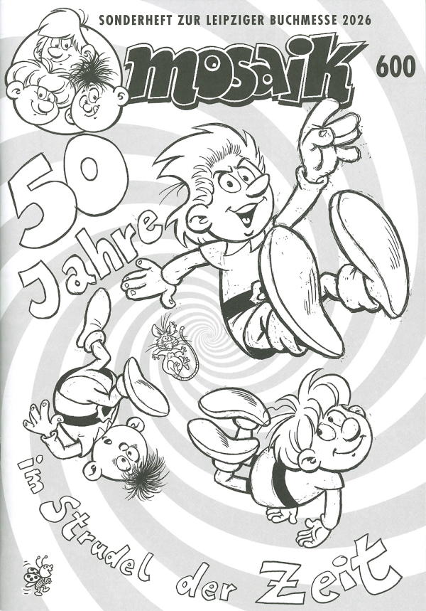 - auf Seite 14 werden „50 Jahre Mosaik“ (mit den Abrafaxen) und das 600. Heft gewürdigt; als Gäste sind Lona Rietschel, Lothar Dräger und Jörg Reuter zu sehen