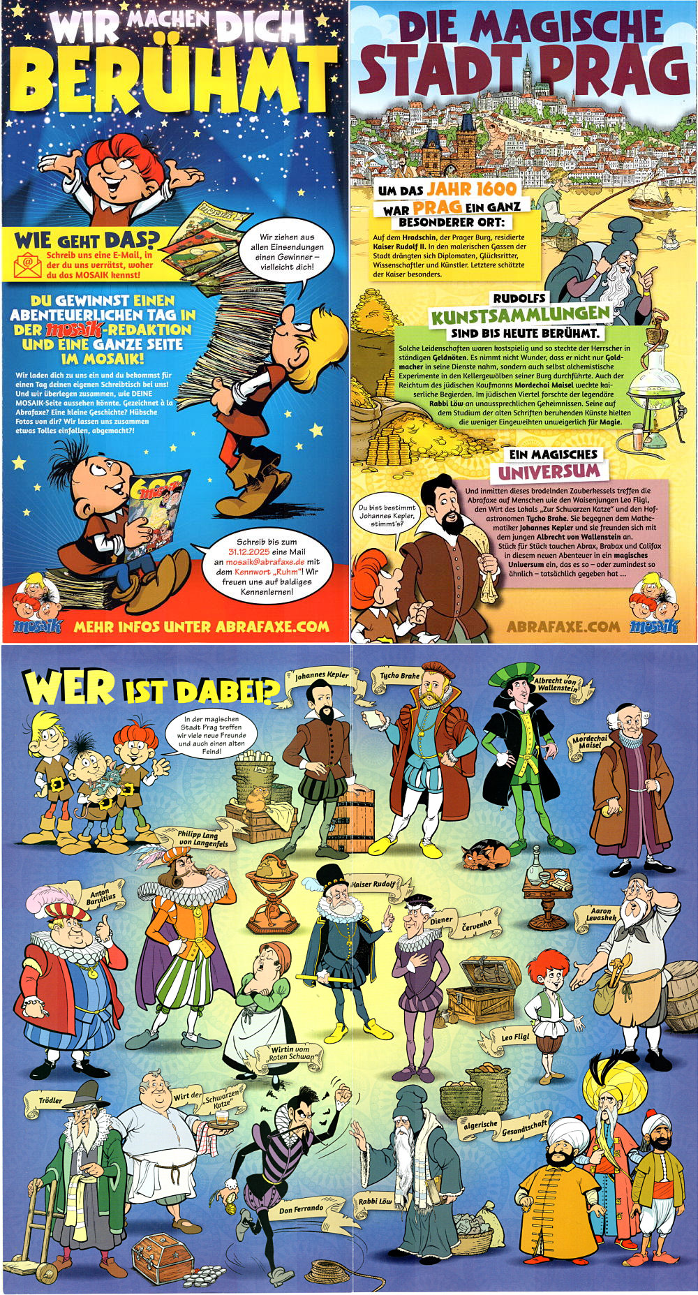 - sowohl im Abo- als auch im Kioskheft ist ein gefalteter Einleger enthalten; auf der Vorderseite steht: „Wir machen dich berühmt“, die Überschrift auf der Rückseite lautet: „Die magische Stadt Prag“, im Innenteil werden die handelnden Personen dargestellt