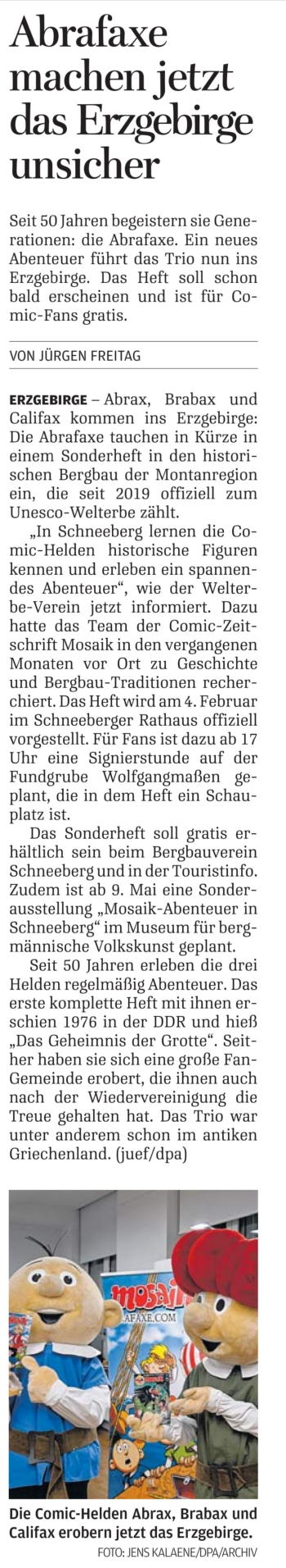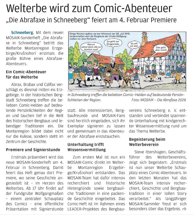 Freie Presse, 06.02.2026, Ausgabe Annaberg, „Abrafaxe erkunden Bergbau im Erzgebirge“ von Thomas Mehlhorn, Seite 11