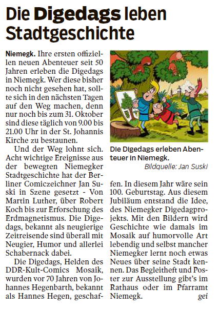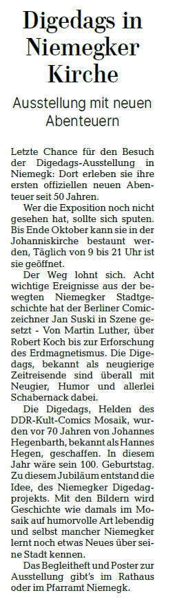 Märkische Allgemeine, 16.10.2025, Ausgabe Brandenburg/Hoher Fläming, „Digedags in Niemegker Kirche“, Seite 15