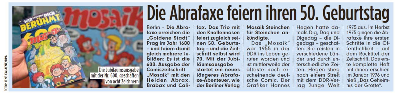 B.Z., 19.11.2025, „Die Abrafaxe feiern ihren 50. Geburtstag“ von Sophia-Caroline Kosel, Seite 13