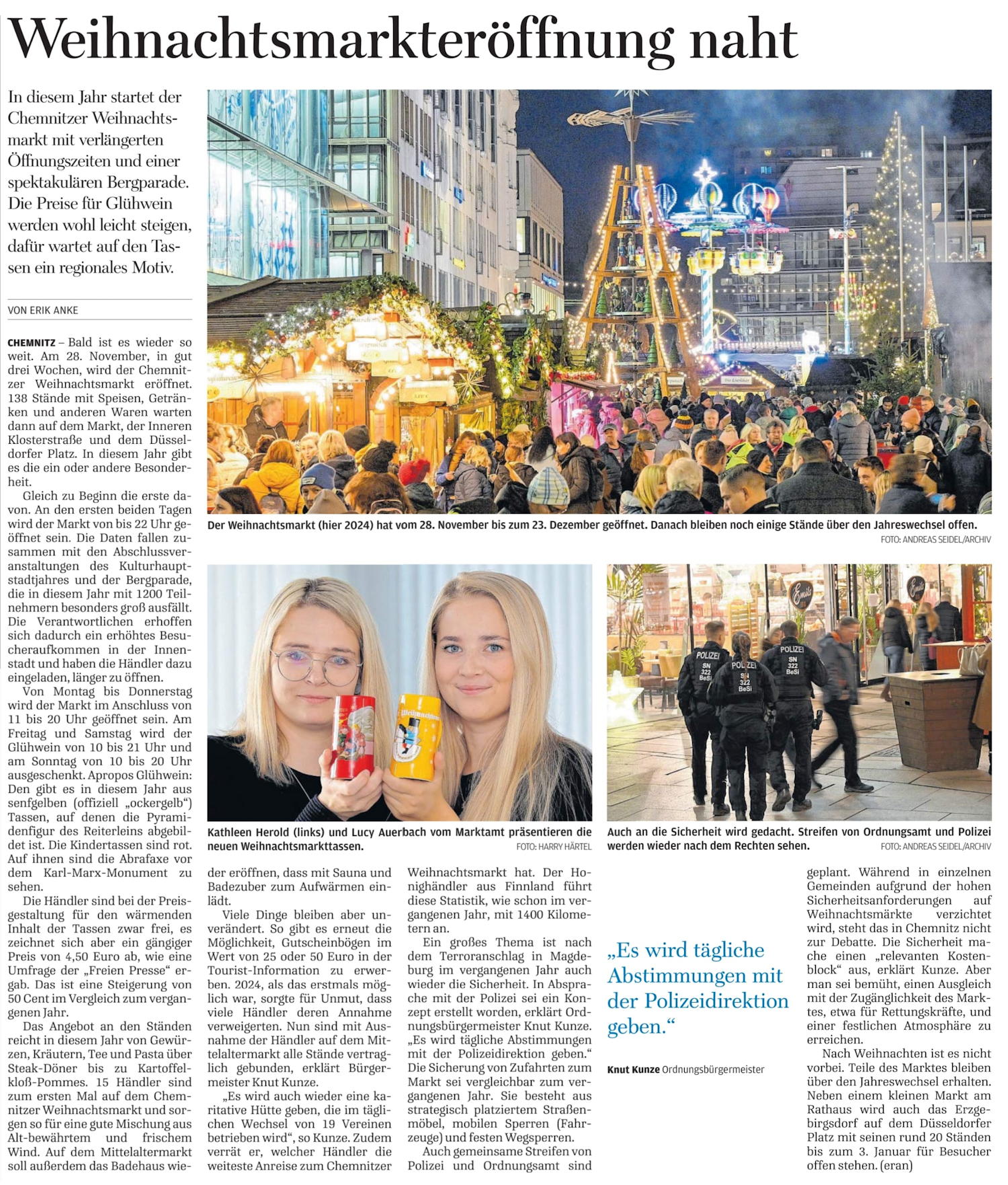 Freie Presse, 06.11.2025, Ausgabe Chemnitz, „Weihnachtsmarkteröffnung naht“ von Erik Anke, Seite 11