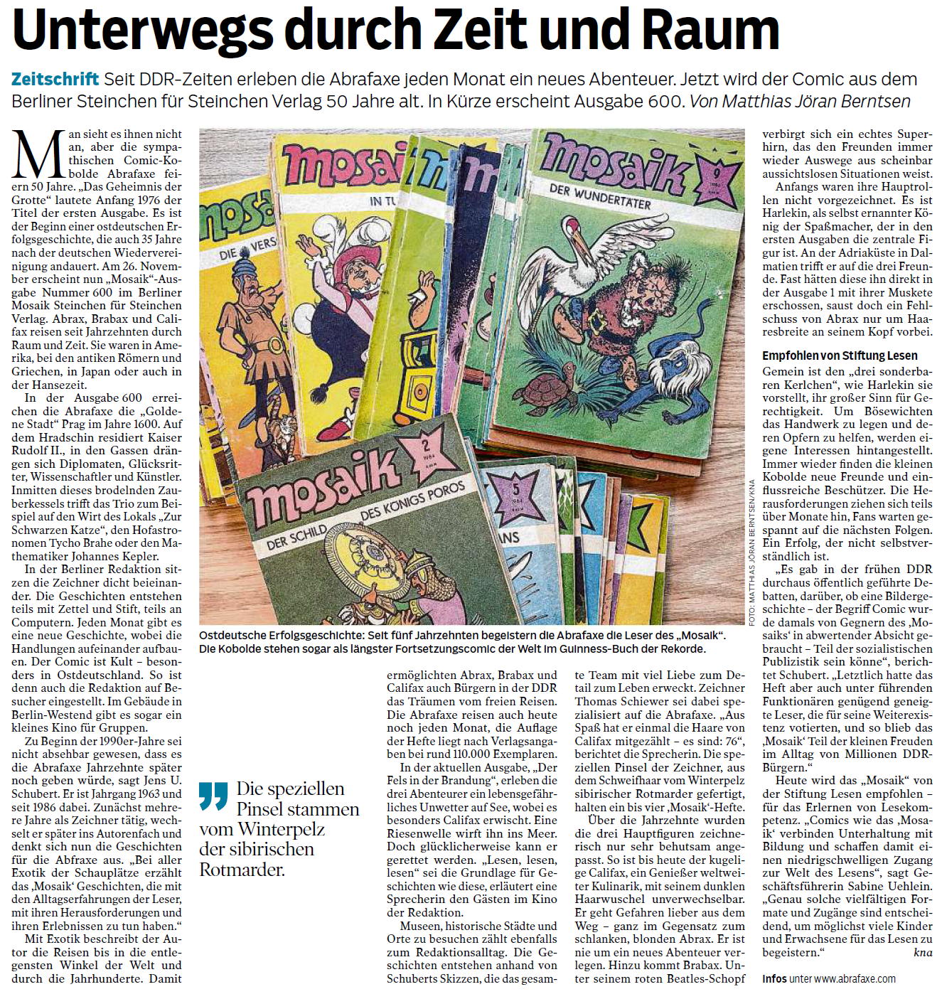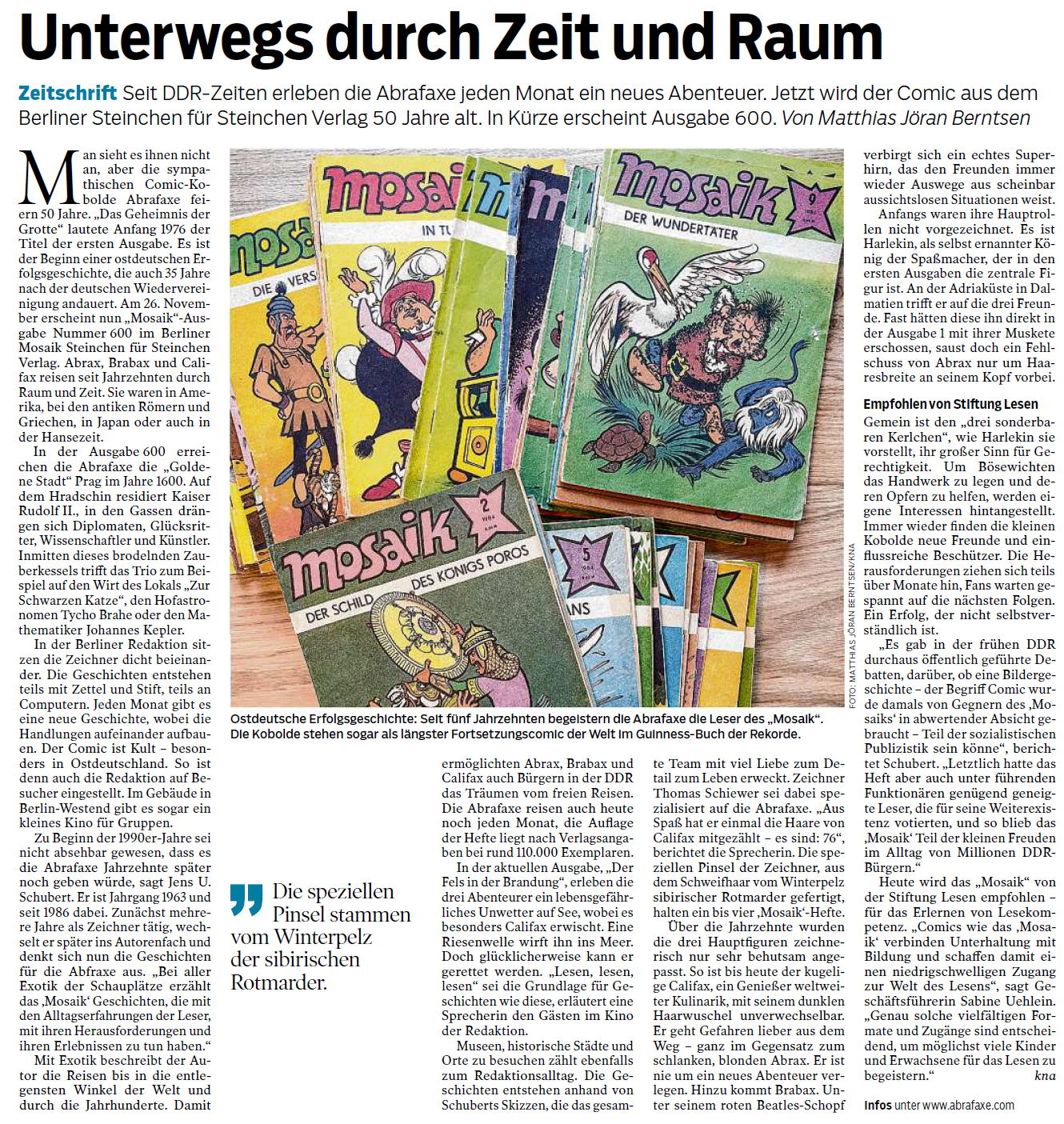 Berliner Zeitung, 20.11.2025, „Comiczeitschrift Abrafaxe feiert drei Jubiläen“ von Sophia-Caroline Kosel, Seite 12