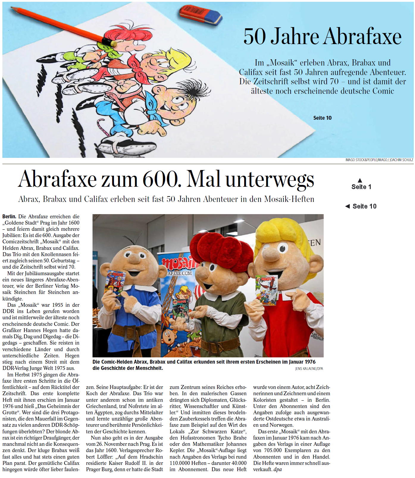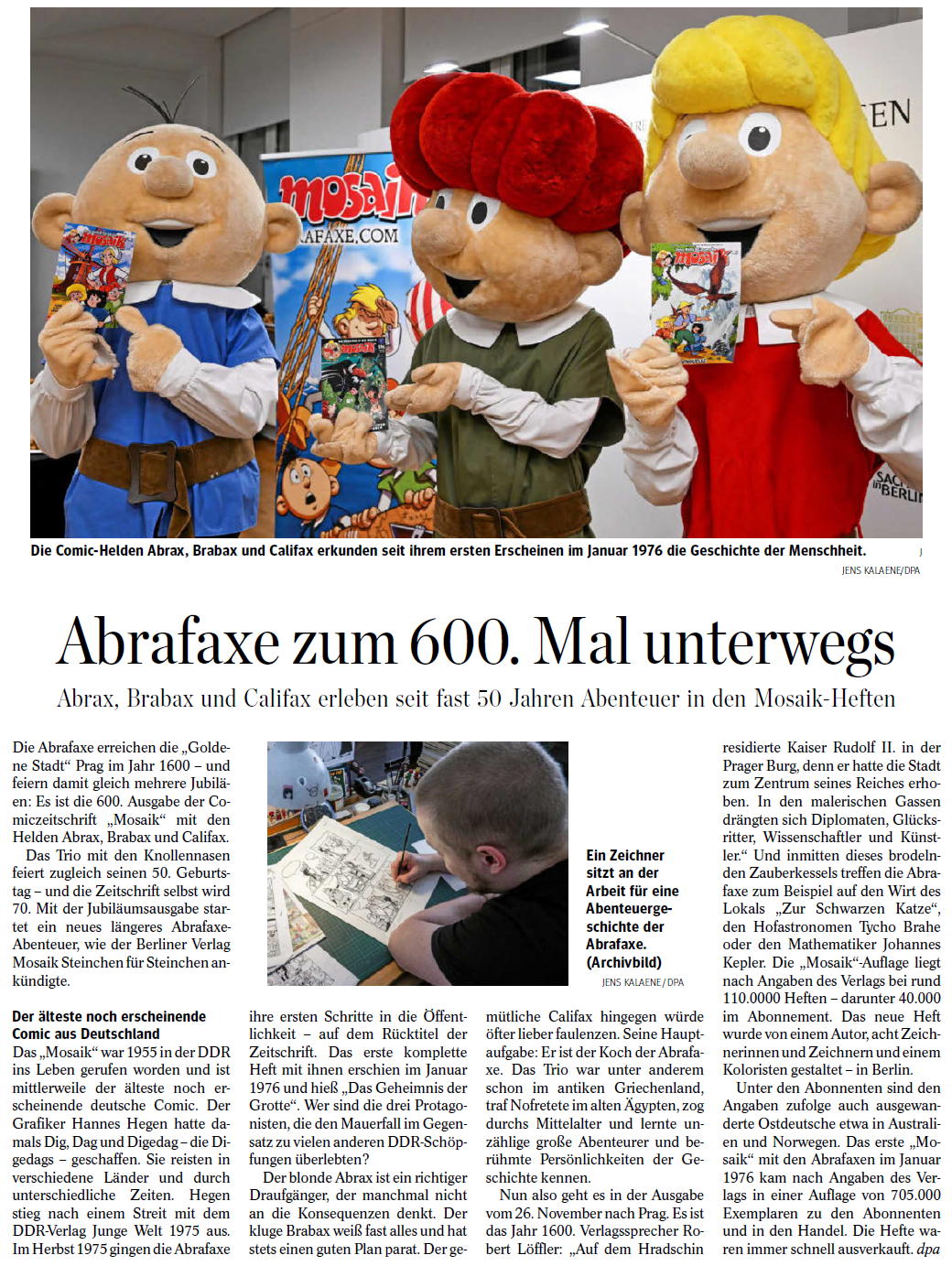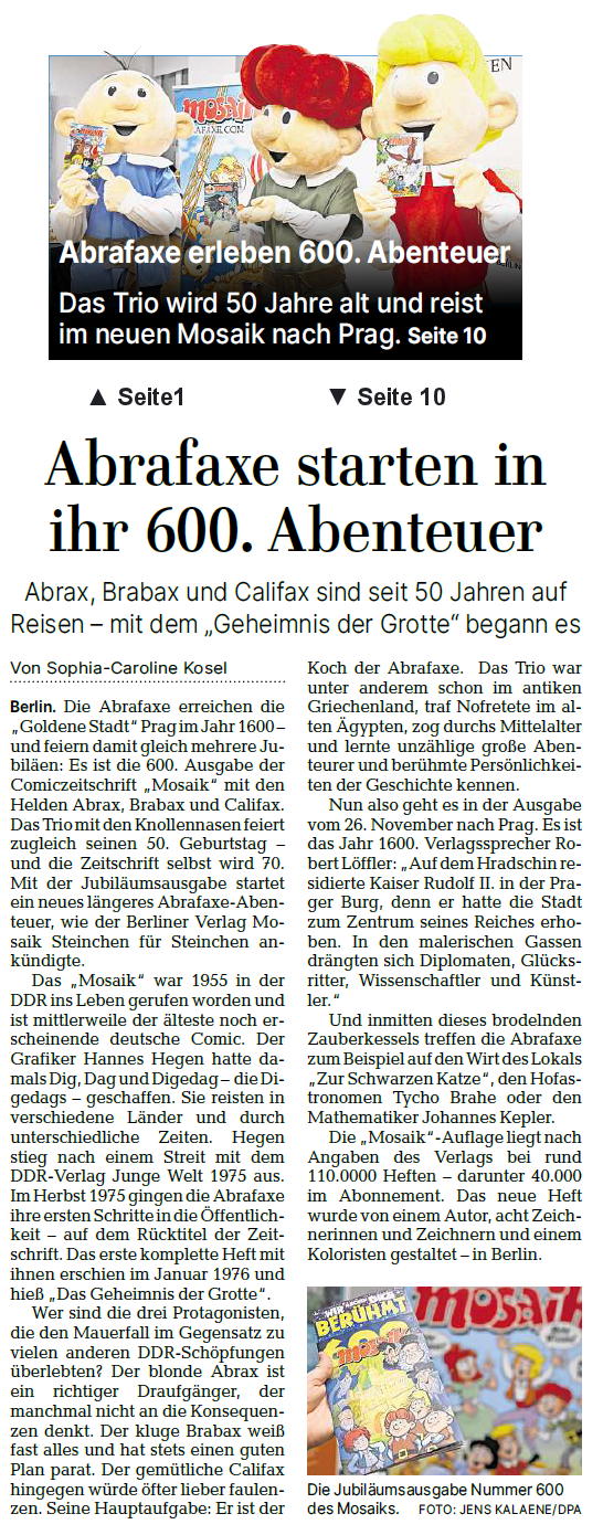 Märkische Allgemeine, 19.11.2025, „Abrafaxe starten in ihr 600. Abenteuer“ von Sophia-Caroline Kosel, Seiten 1 und 10