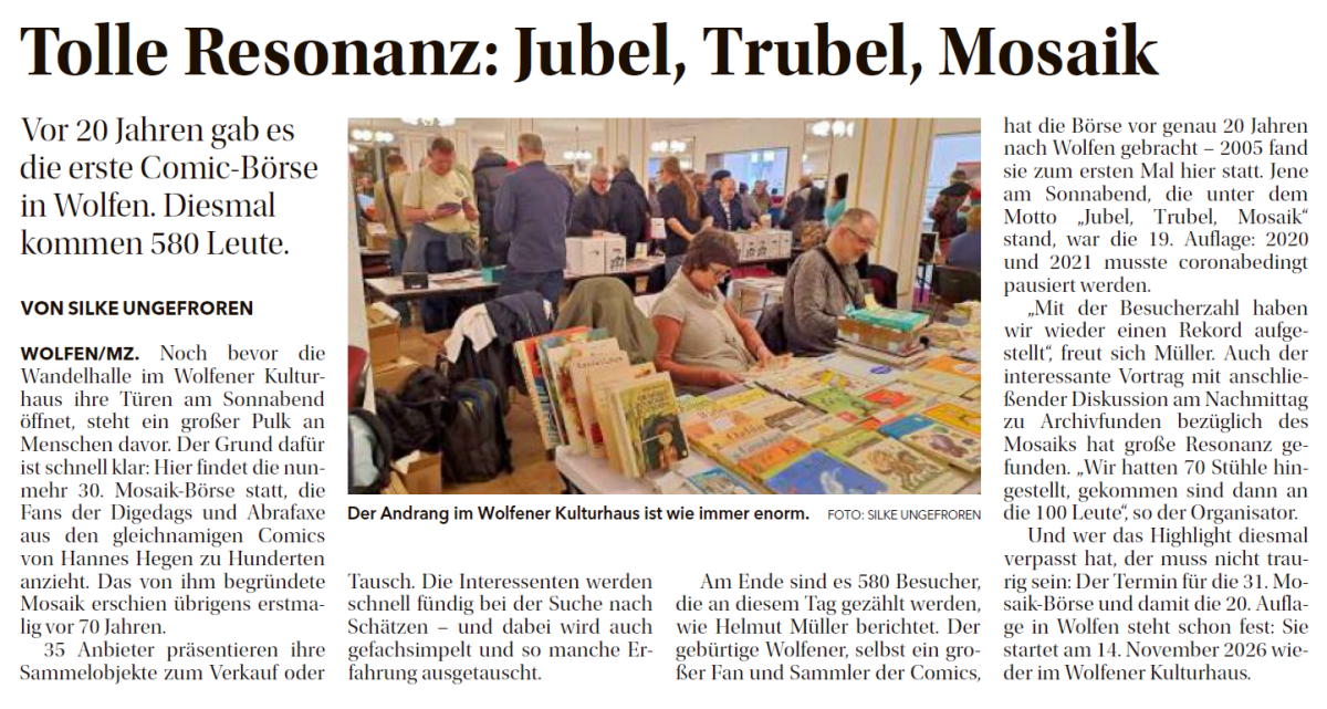 Mitteldeutsche Zeitung, 17.11.2025, Ausgabe Bitterfeld, „Tolle Resonanz: Jubel, Trubel, Mosaik“ von Silke Ungefroren, Seite 9