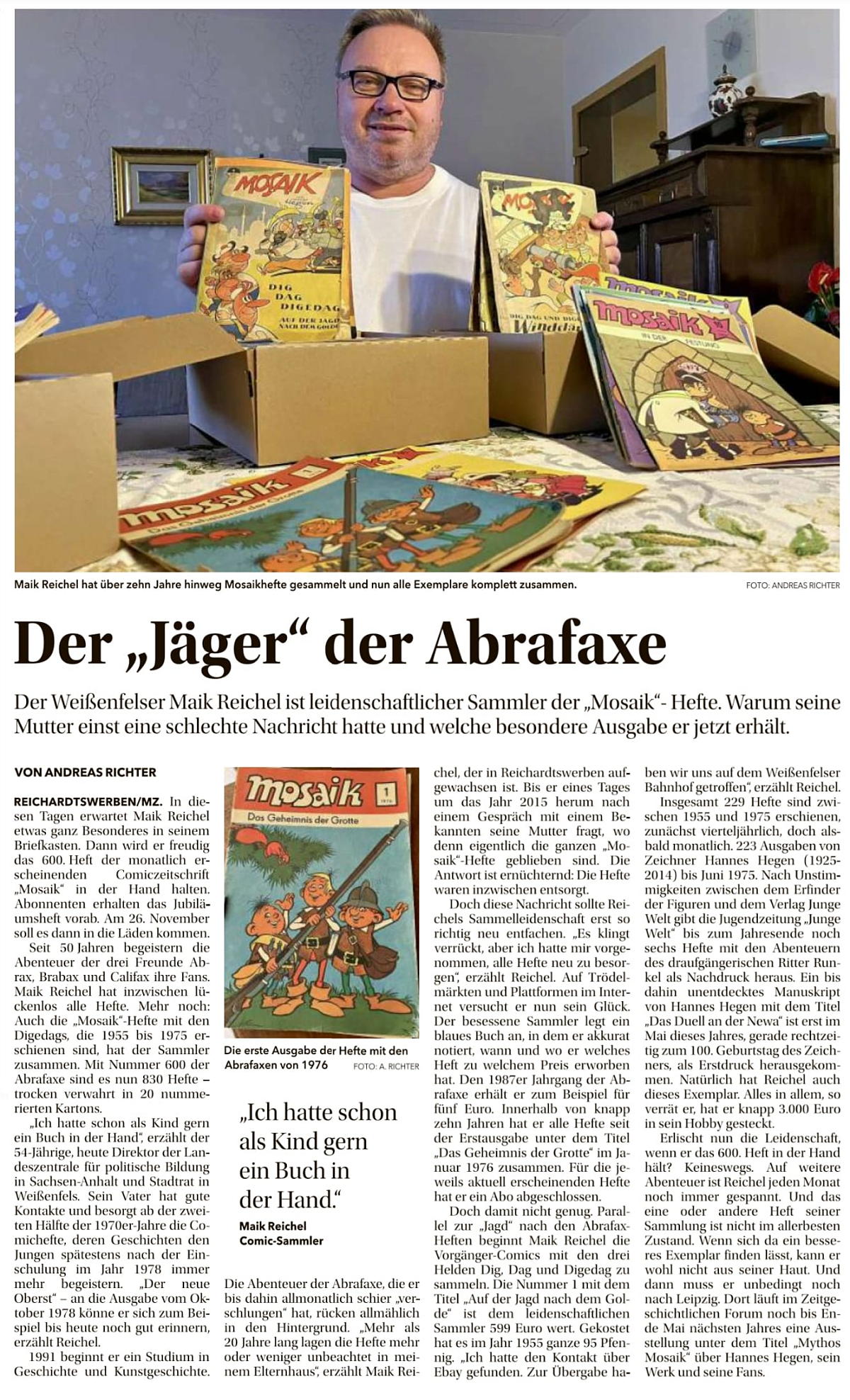 Mitteldeutsche Zeitung, 21.11.2025, Ausgabe Weißenfels, „Der ‚Jäger‘ der Abrafaxe“ von Andreas Richter, Seite 14