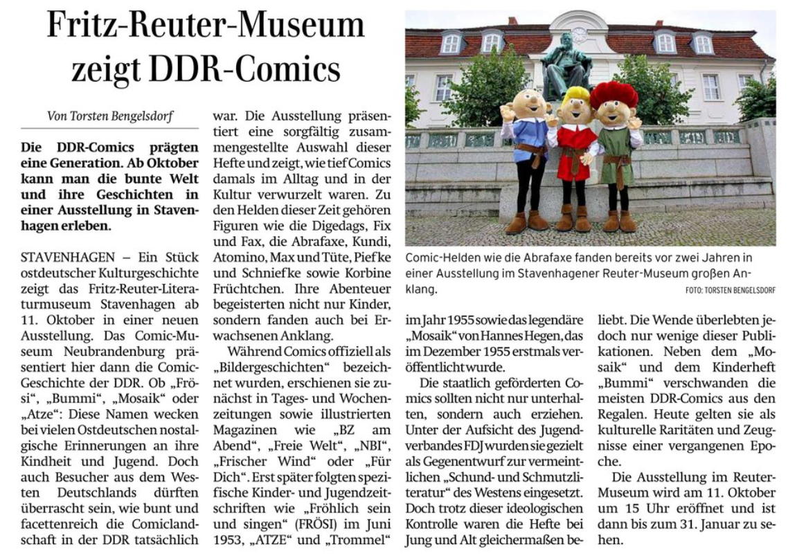 eröffnet. Sie kann bis 31. Januar 2026 besichtigt werden. Ein Stück ostdeutscher Kulturgeschichte wird vom Comic-Museum Neubrandenburg