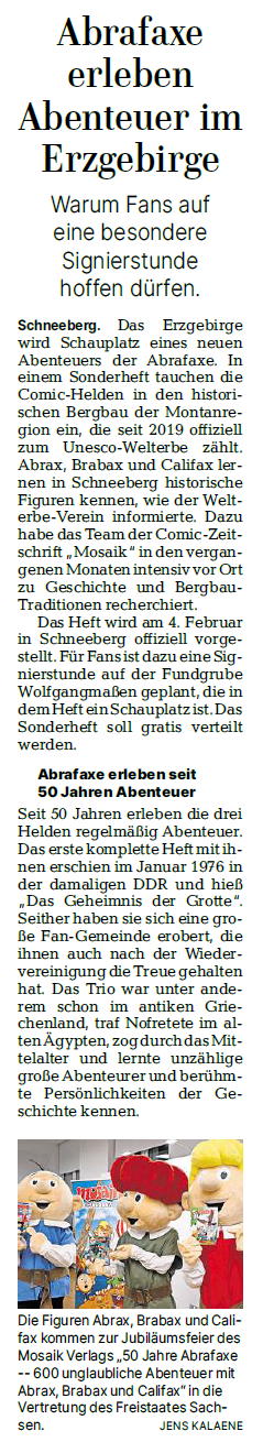 Die Ausgabe Annaberg der Freien Presse bemerkte am 21. Januar 2026: Abrafaxe machen jetzt das Erzgebirge unsicher.