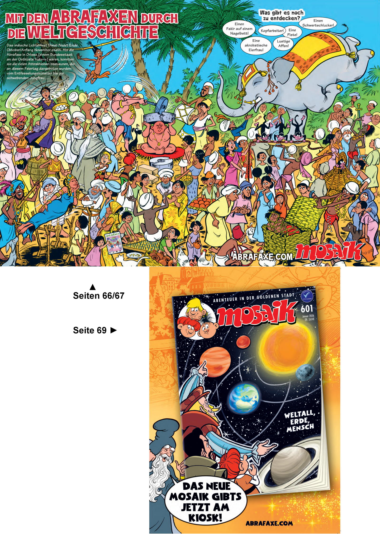 Monatlich werden Such- und Wimmelbilder mit den Abrafaxen und MOSAIK-Werbung veröffentlicht.