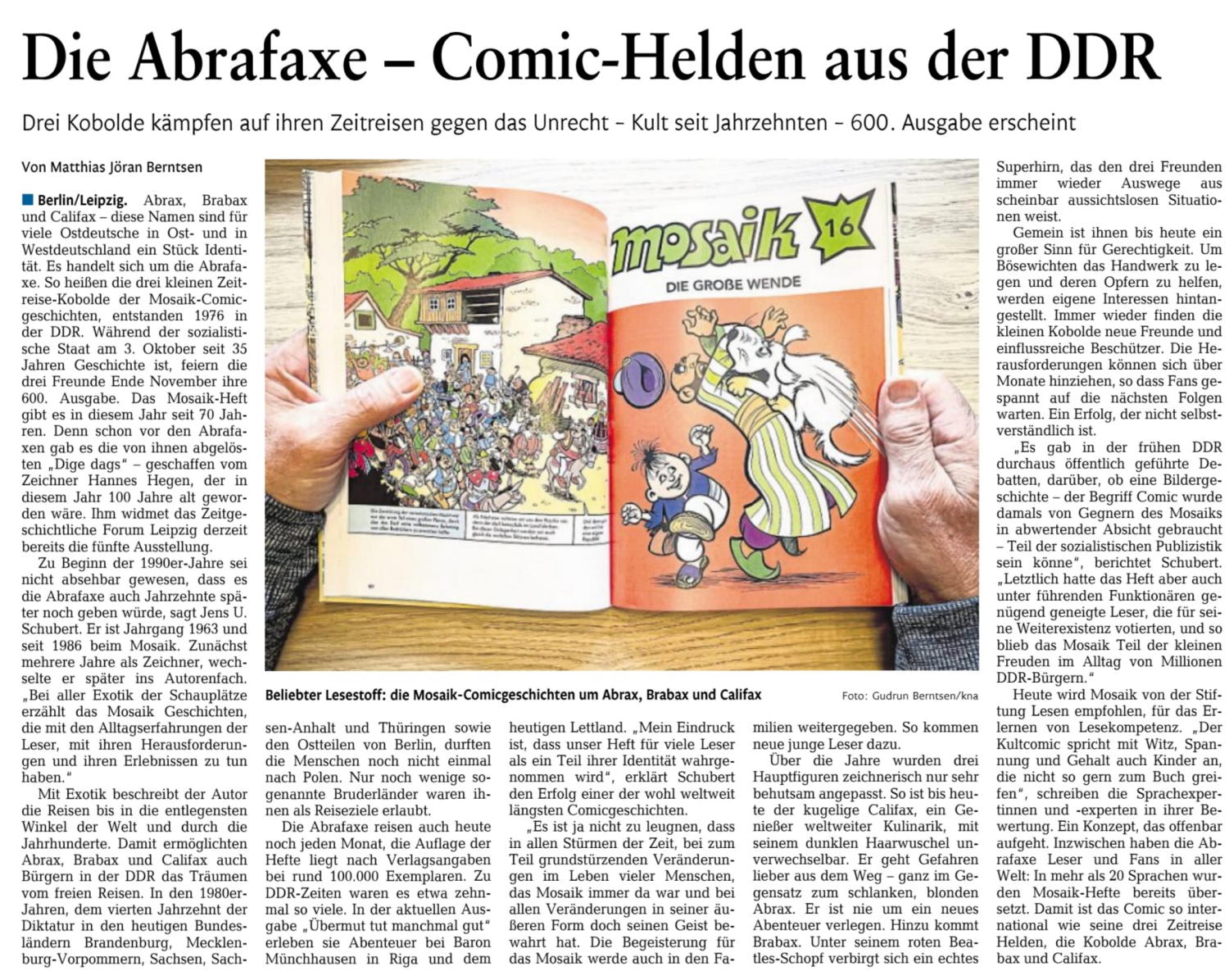 Abrafaxen hingewiesen, das zum Ende des Jahres erscheinen wird. In dem Beitrag kommt der Mosaik-Autor Jens U. Schubert zu Wort,