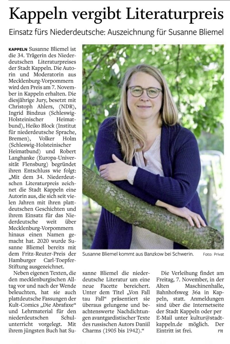 dass die Autorin und Moderatorin Susanne Bliemel aus Mecklenburg-Vorpommern den 34. Niederdeutschen Literaturpreis der