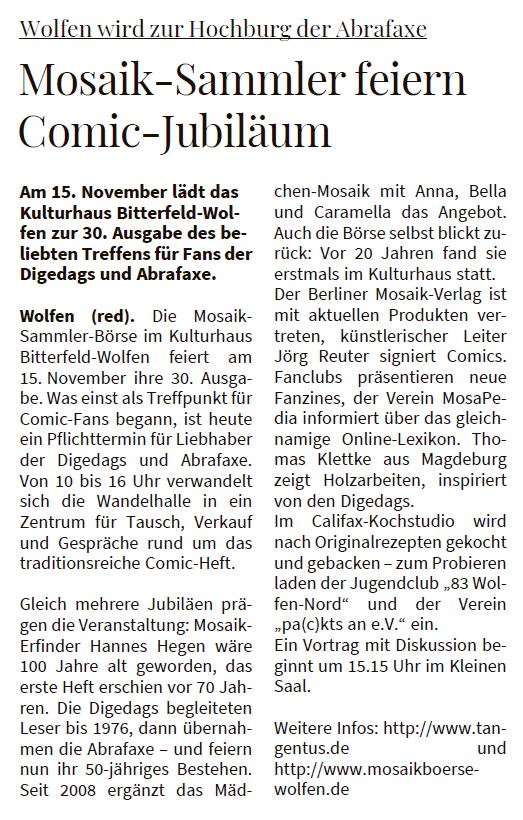 Der MOSAIKER teilt mit: In diesem Jahr wird es zur Börse in Wolfen kein neues MOSAIKER-Fanzine geben. Dafür