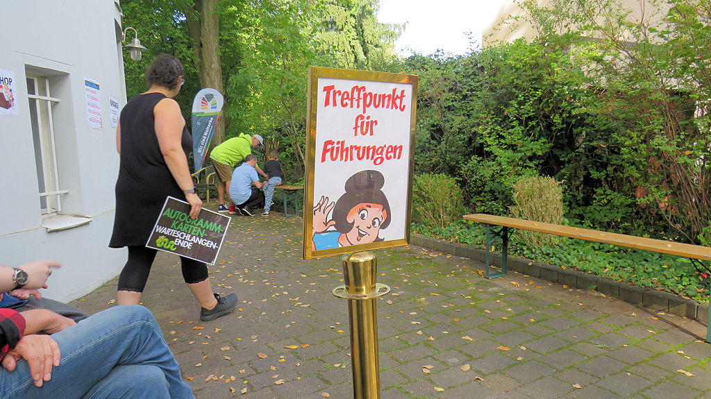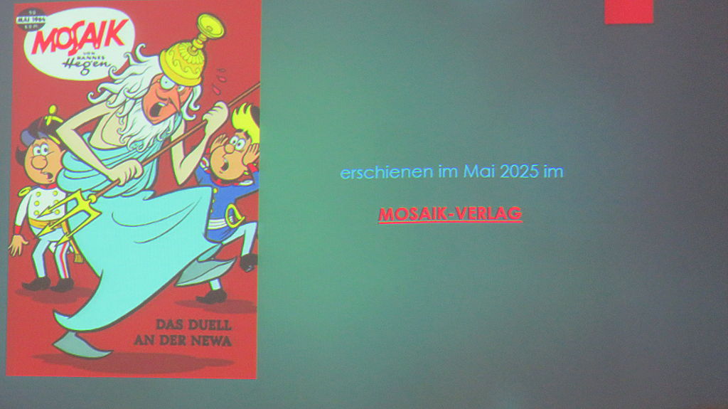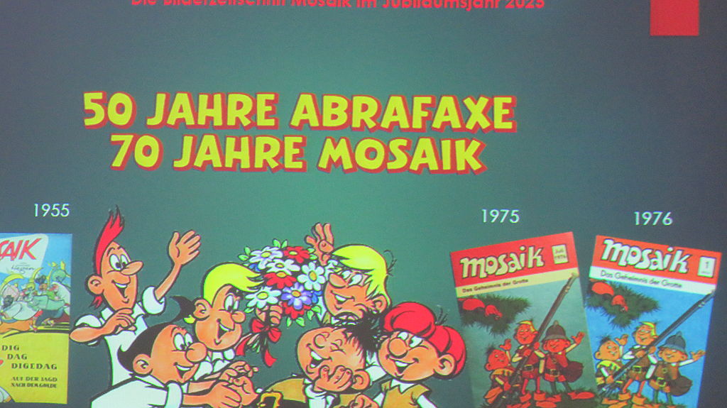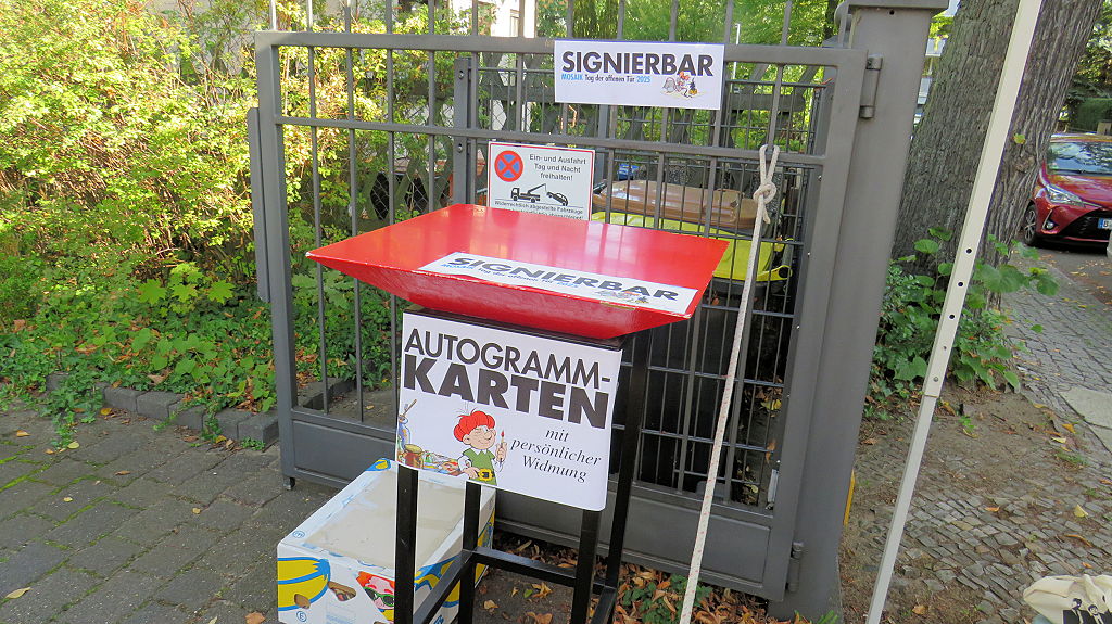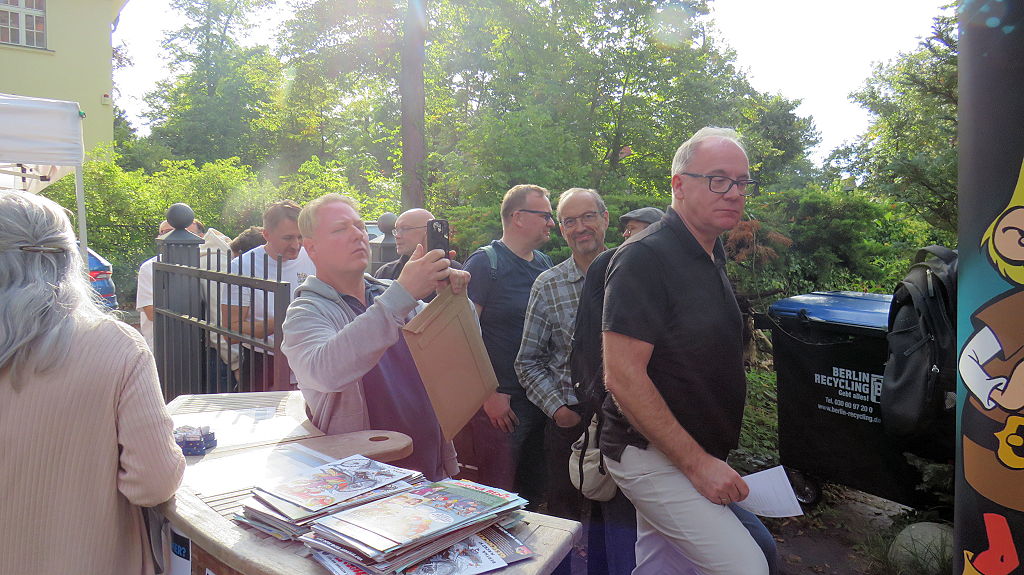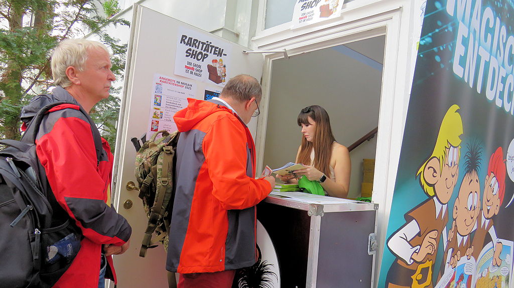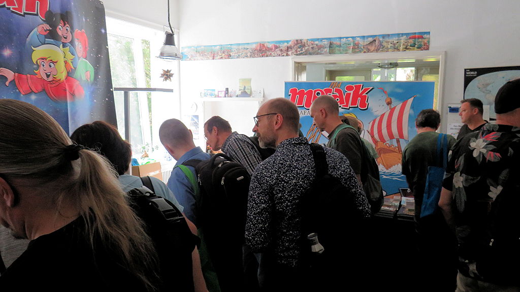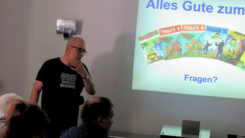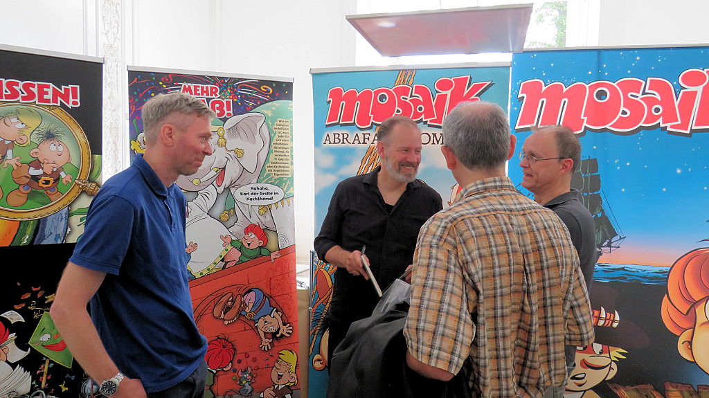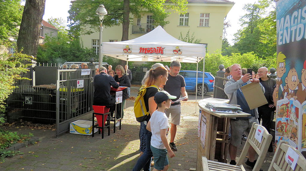 Nun ist der Termin im Endsommer für den Tag der offenen Tür beim Mosaik Steinchen für Steinchen Verlag bereits etabliert, und das späte Hochsommerwetter kam zur Veranstaltung im Jubiläumsjahr wie bestellt. Wieder gab es einen Riesen-Ansturm der Fans, ein volles Haus und lange Schlangen. Interessante Vorträge zur Geschichte und zur Zukunft des Mosaik, der Mosaik-Shop mit vielen Raritäten, die traditionelle Verlagsführung im 15-Minuten-Takt, die Fanclubangebote und besonders auch die Autogramme der Zeichner waren gefragt. Die exklusive Ausbeute an Verlagsprodukten, Sammlerstücken und Autogrammen erfreute das Sammlerherz.