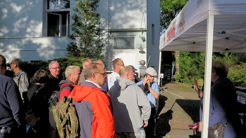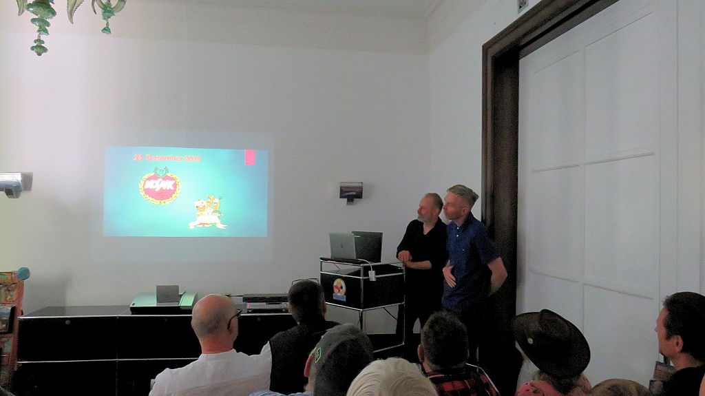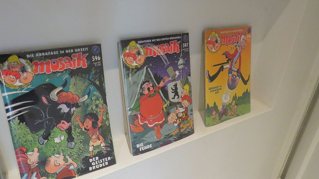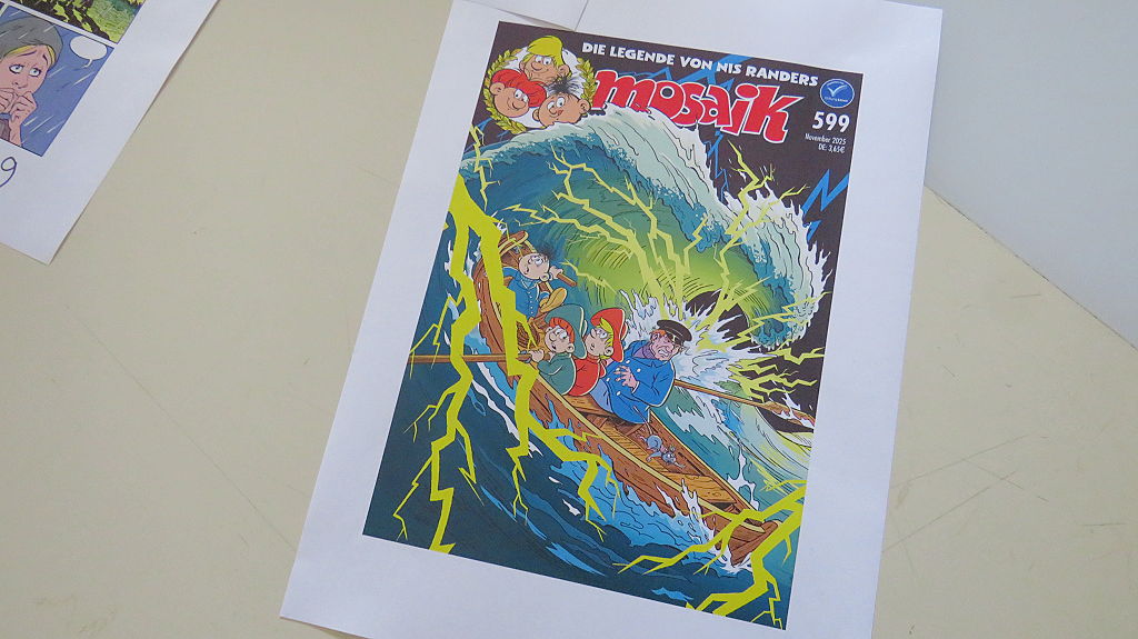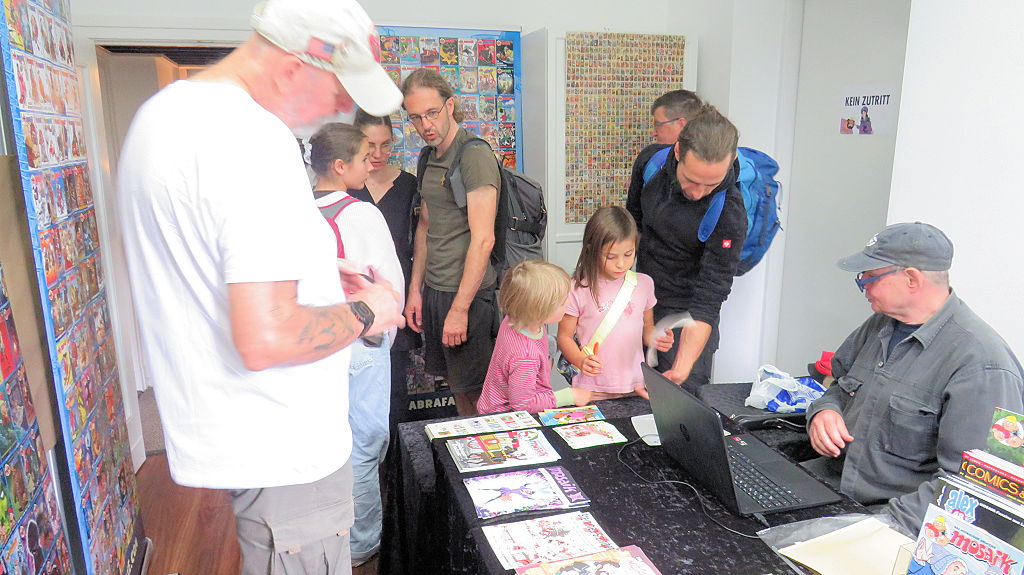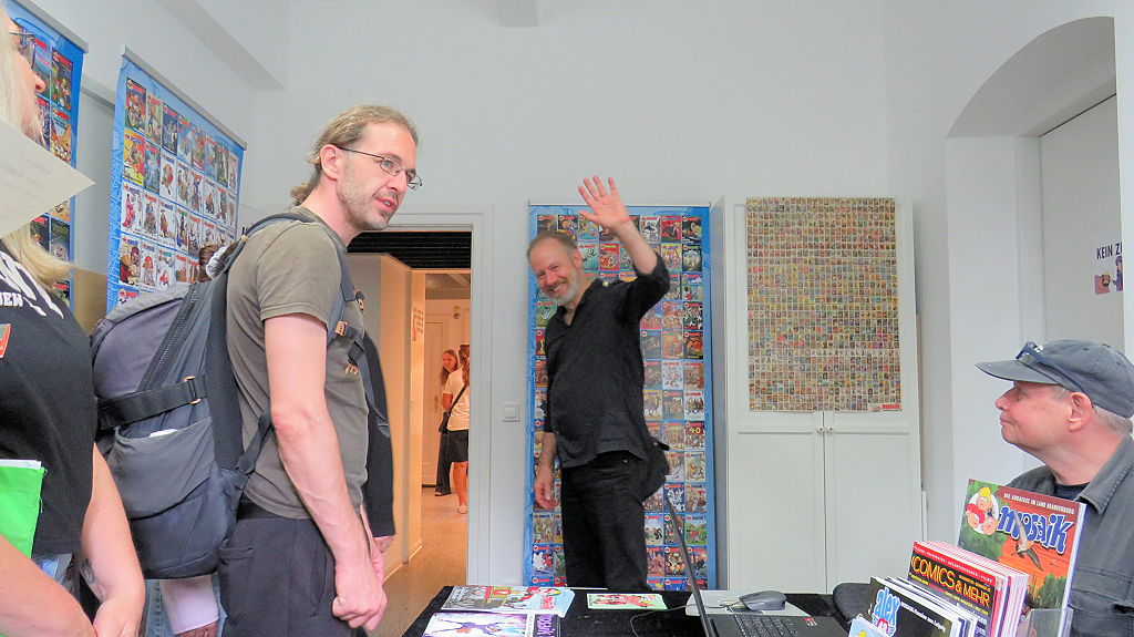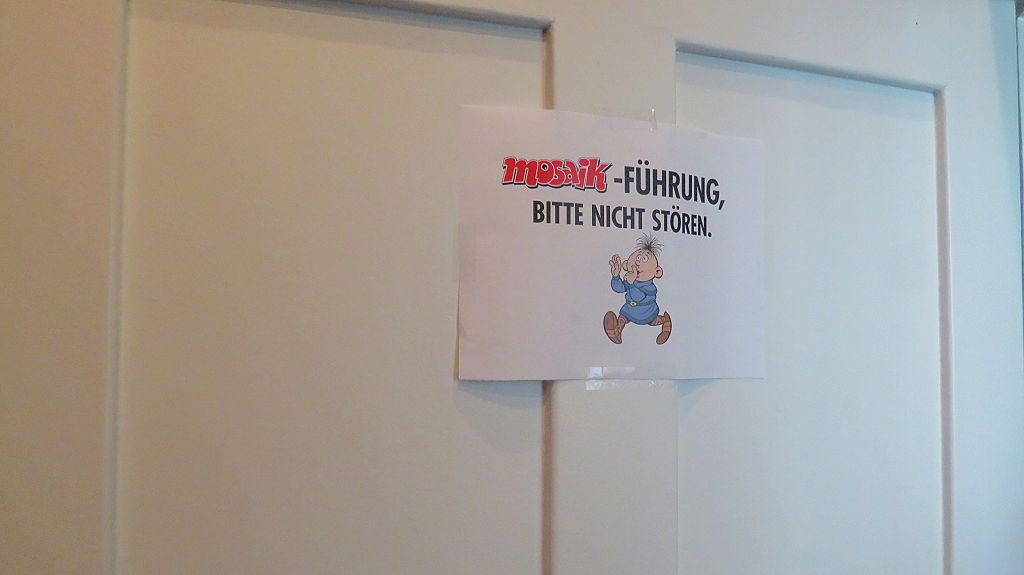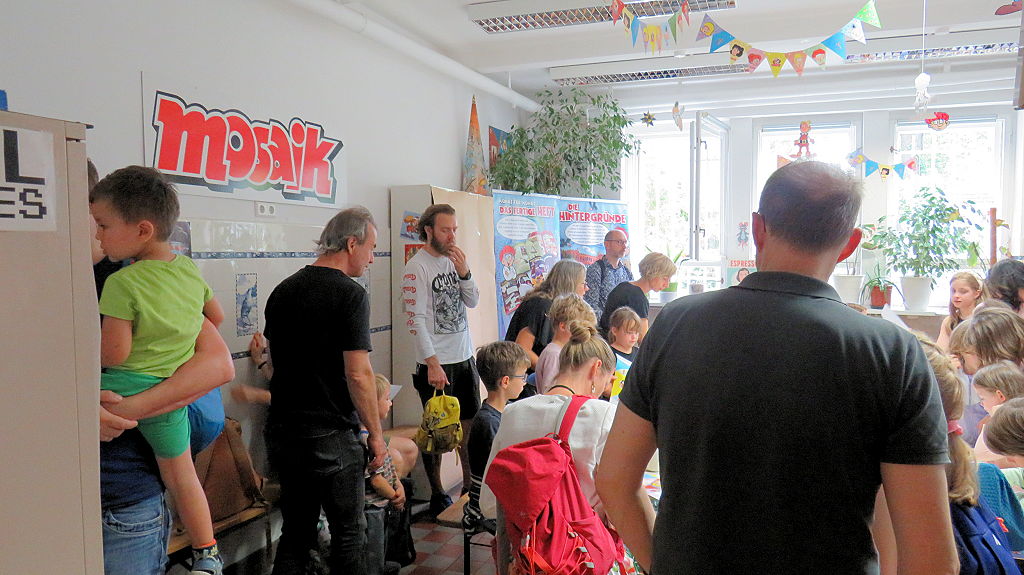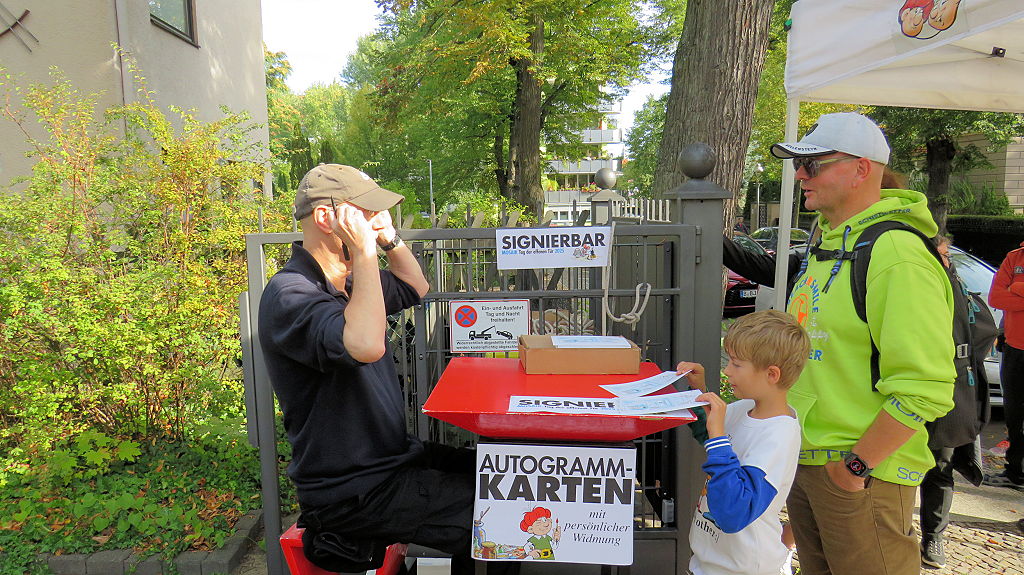 Nun ist der Termin im Endsommer für den Tag der offenen Tür beim Mosaik Steinchen für Steinchen Verlag bereits etabliert, und das späte Hochsommerwetter kam zur Veranstaltung im Jubiläumsjahr wie bestellt. Wieder gab es einen Riesen-Ansturm der Fans, ein volles Haus und lange Schlangen. Interessante Vorträge zur Geschichte und zur Zukunft des Mosaik, der Mosaik-Shop mit vielen Raritäten, die traditionelle Verlagsführung im 15-Minuten-Takt, die Fanclubangebote und besonders auch die Autogramme der Zeichner waren gefragt. Die exklusive Ausbeute an Verlagsprodukten, Sammlerstücken und Autogrammen erfreute das Sammlerherz.