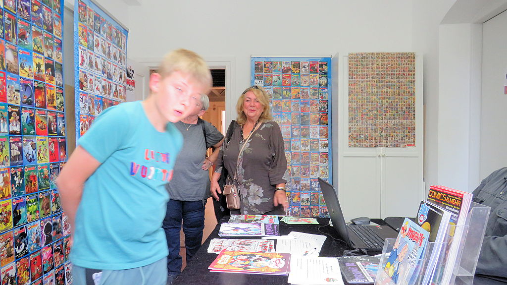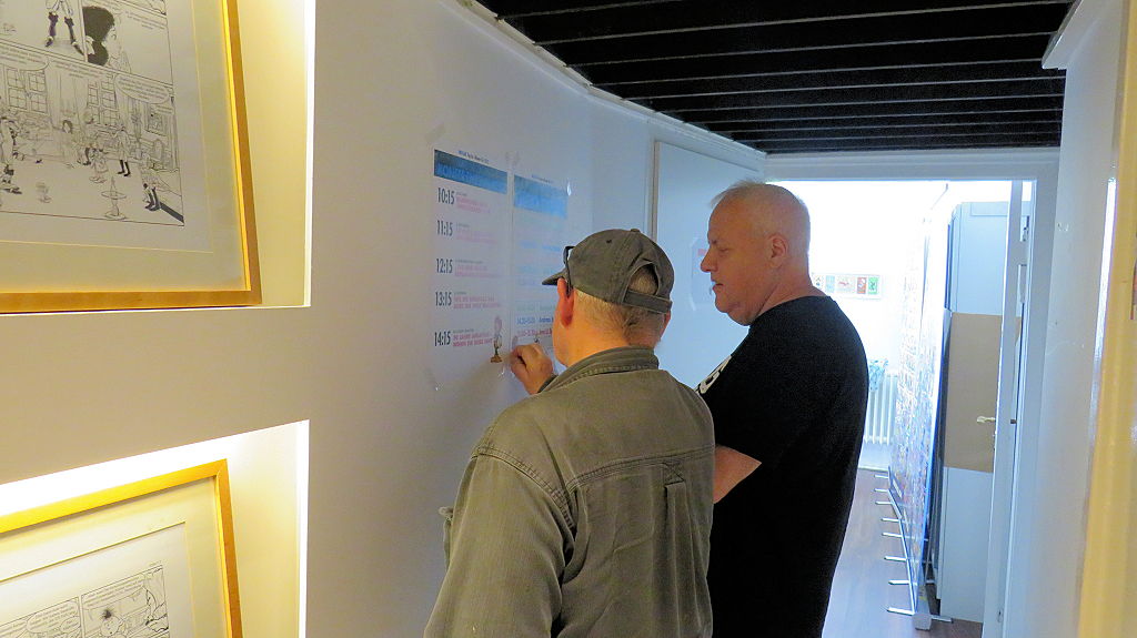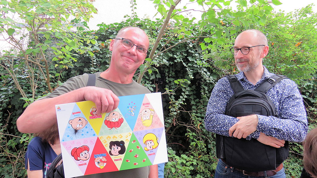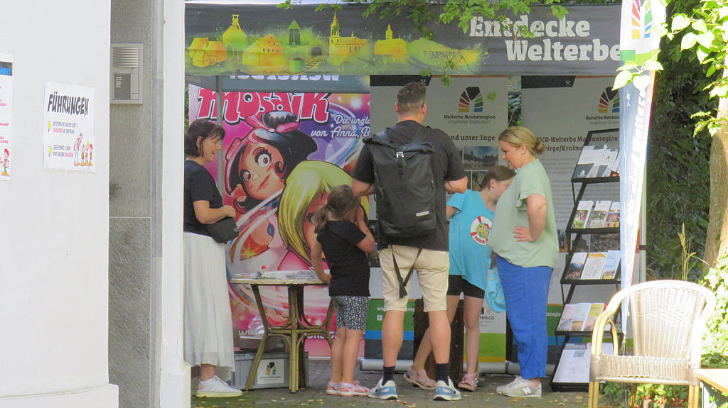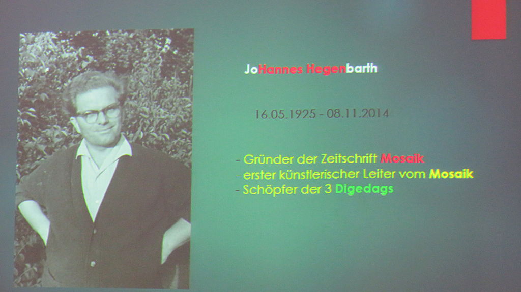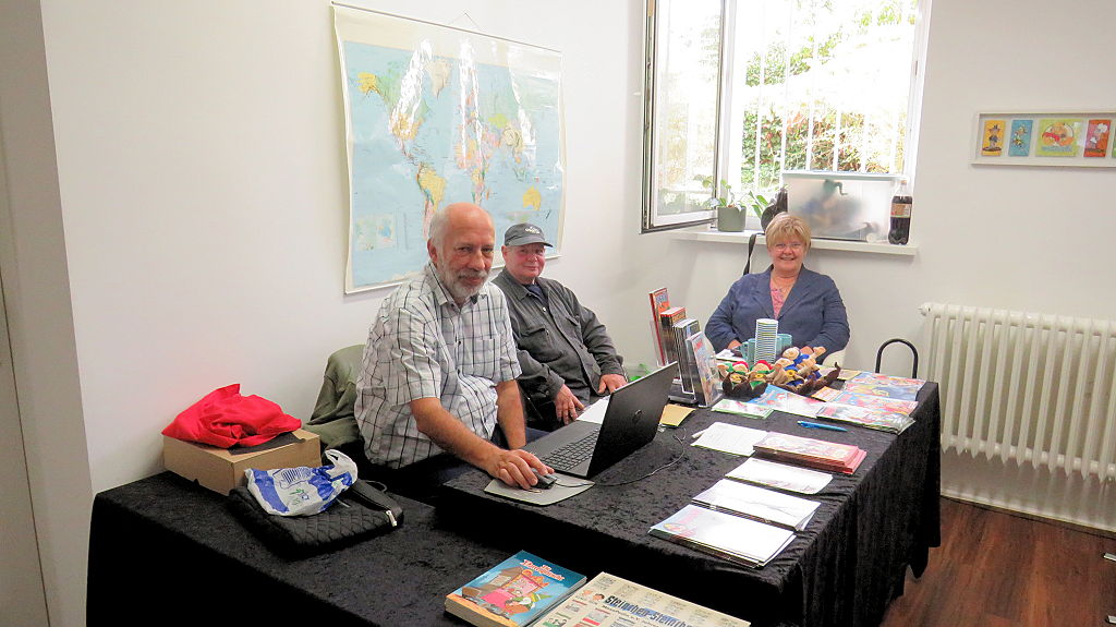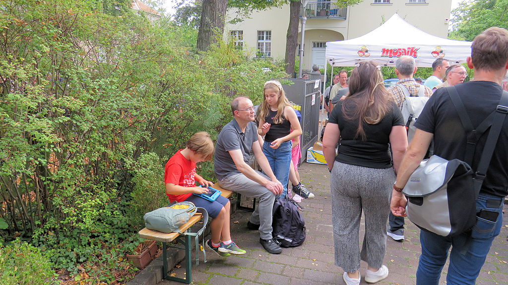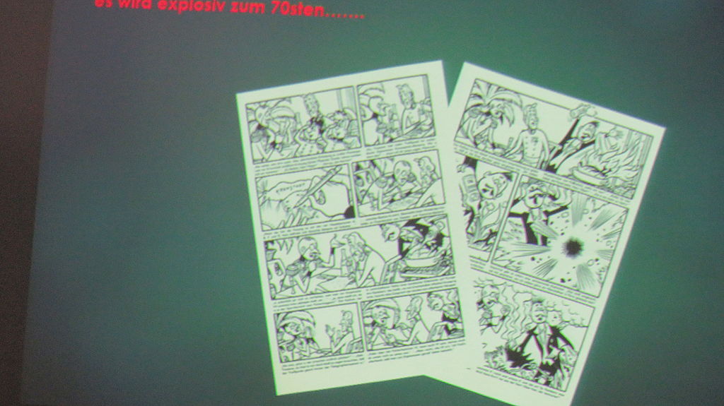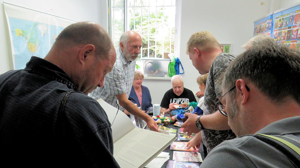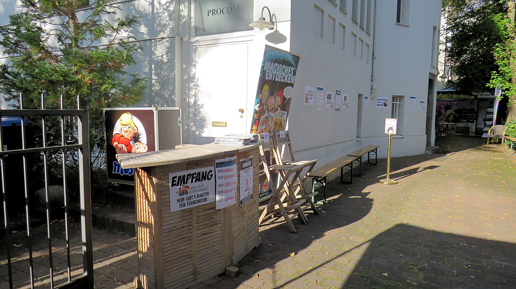 Nun ist der Termin im Endsommer für den Tag der offenen Tür beim Mosaik Steinchen für Steinchen Verlag bereits etabliert, und das späte Hochsommerwetter kam zur Veranstaltung im Jubiläumsjahr wie bestellt. Wieder gab es einen Riesen-Ansturm der Fans, ein volles Haus und lange Schlangen. Interessante Vorträge zur Geschichte und zur Zukunft des Mosaik, der Mosaik-Shop mit vielen Raritäten, die traditionelle Verlagsführung im 15-Minuten-Takt, die Fanclubangebote und besonders auch die Autogramme der Zeichner waren gefragt. Die exklusive Ausbeute an Verlagsprodukten, Sammlerstücken und Autogrammen erfreute das Sammlerherz.