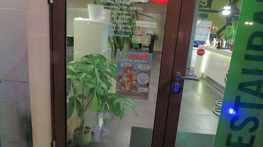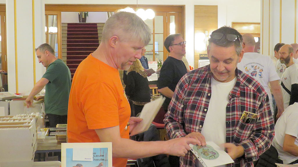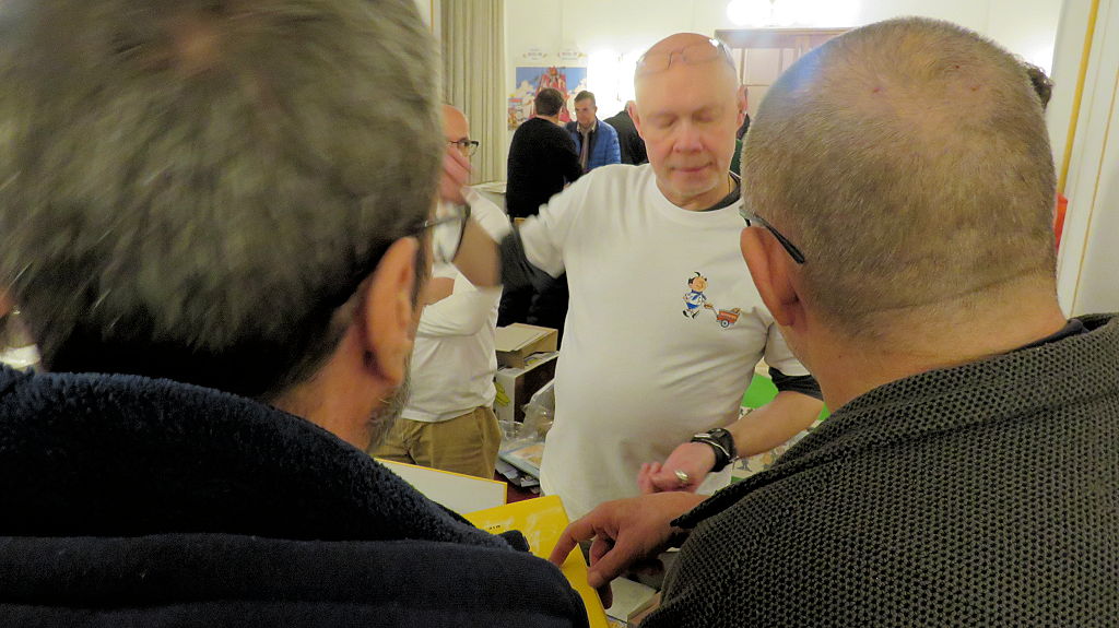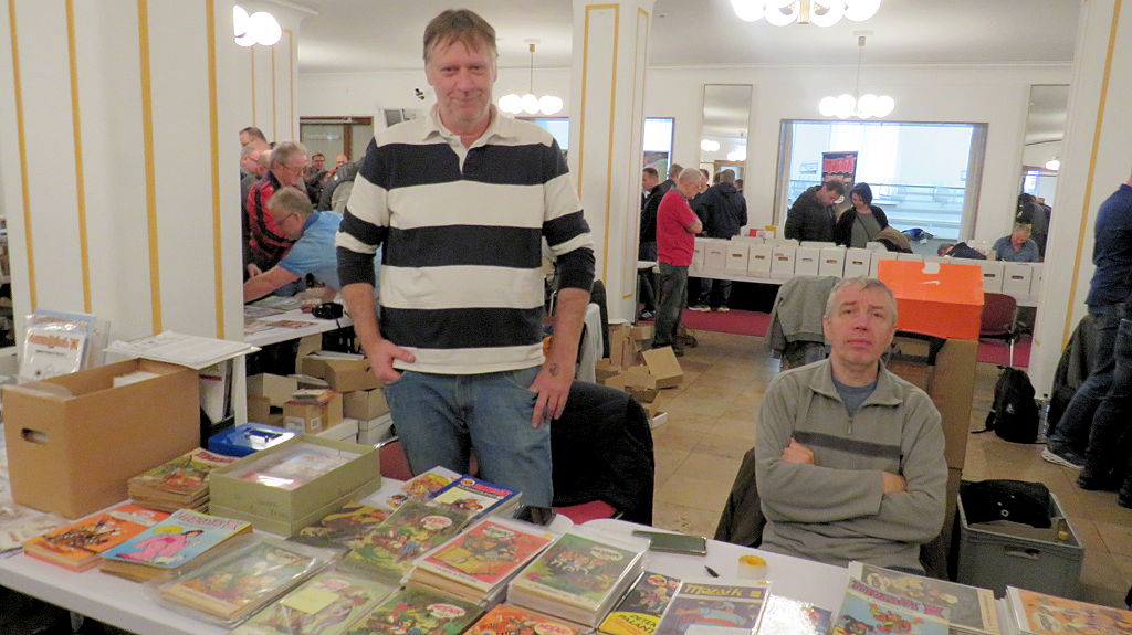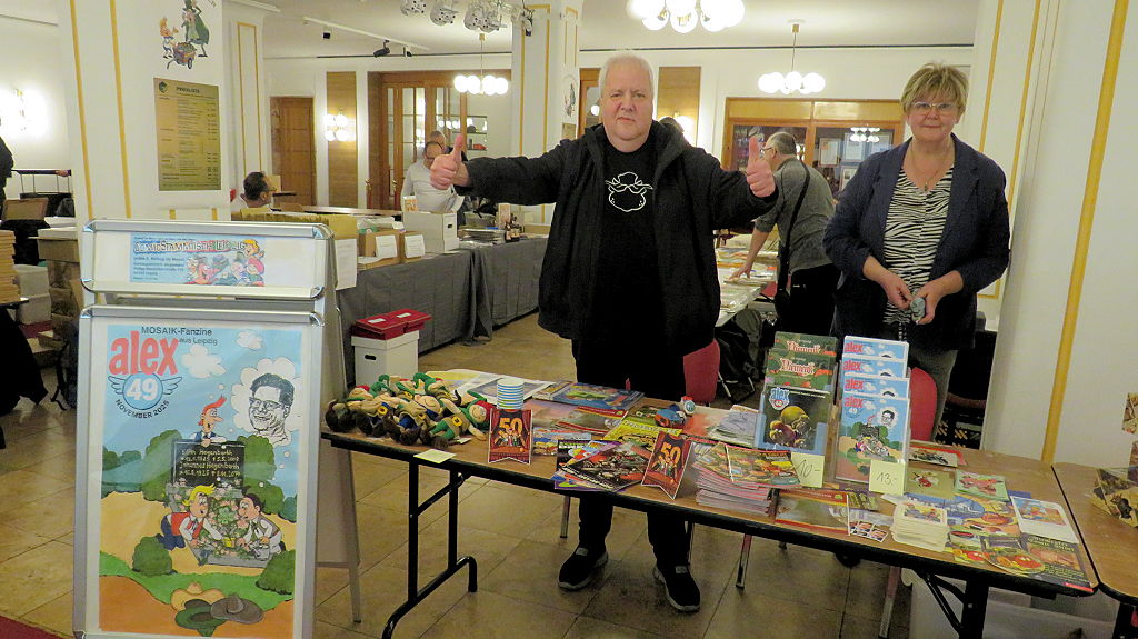 Die 30. Mosaik-Börse machte der Jubiläumszahl alle Ehre, denn auch die anderen Jubiläen des Mosaik-Universums wurden ausgiebig gefeiert. Deshalb war es zu erwarten, dass erneut eine Rekordzahl an Besuchern in das Kulturhaus Wolfen drängte. Wie immer gab es neben den Angeboten an Mosaik-Heften und -Büchern zahlreiche neue Magazine der Fanclubs, dazu neue Ausgaben bzw. Updates der Digedags- und Abrafaxe-Kataloge sowie ein reichhaltiges Sortiment des Mosaik Steinchen für Steinchen Verlags. An letzterem Stand war der künstlerische Leiter Jörg Reuter immer dicht umlagert.